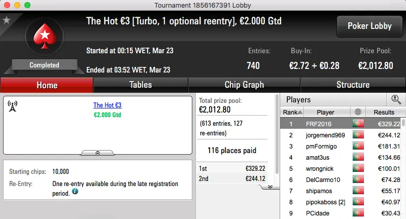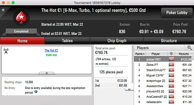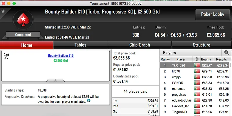 Ricardo "rmsgold" Pereirinha teve uma noite muito boa nas mesas da PokerStars.pt. Arrancou a noite com uma vitória no Bounty Builder €30 (€1,216) e terminou-a com o título no The Hot BigStack Turbo €50, mais €1,473 a rumar à sua conta.
