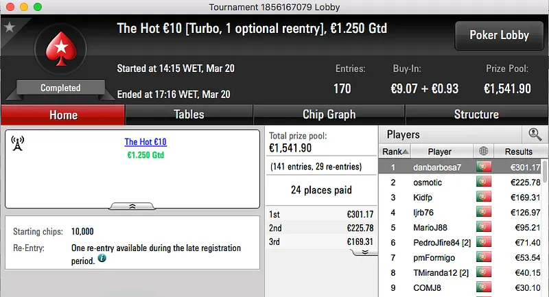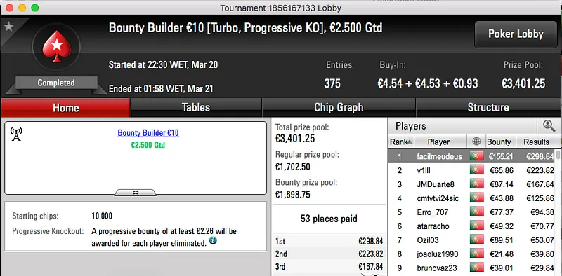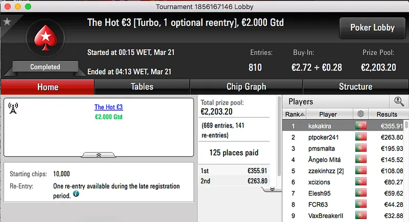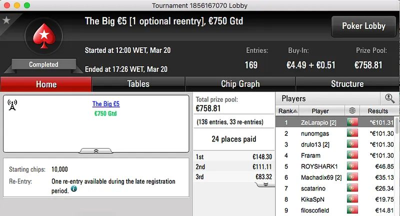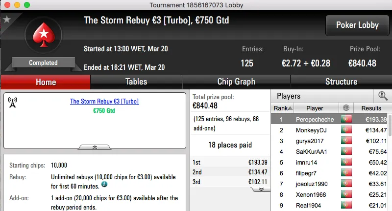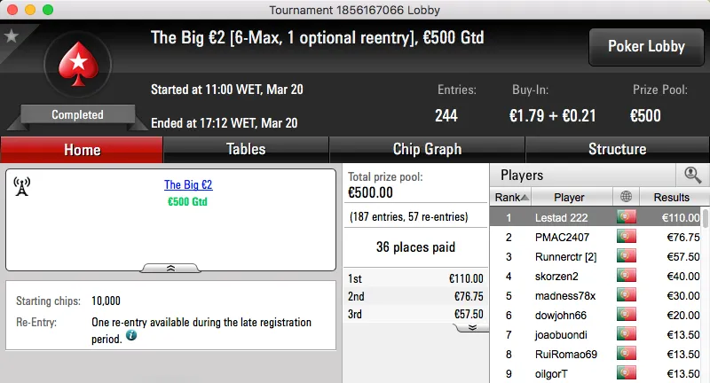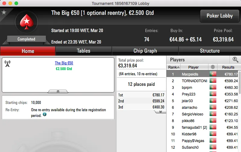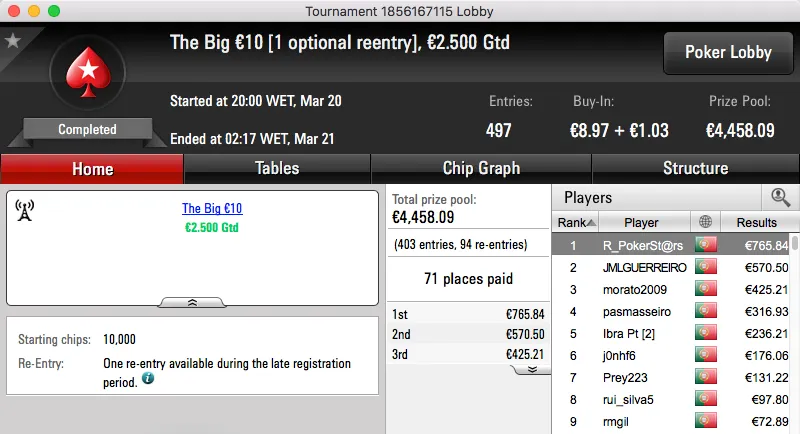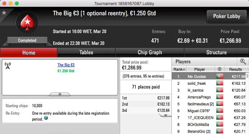 O pódio fecha com a vitória de TORNAD0TONI no The Big €100, rendeu €1,414.