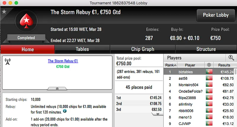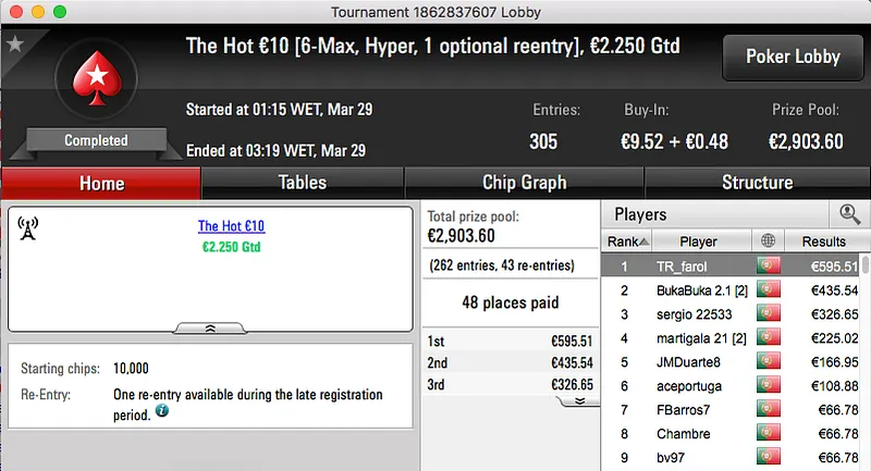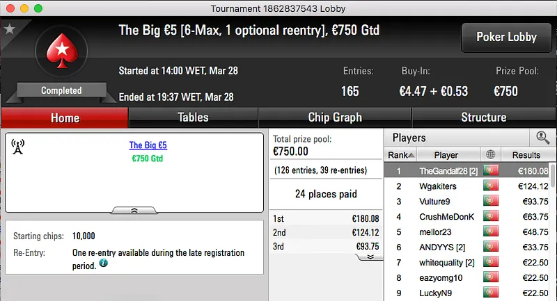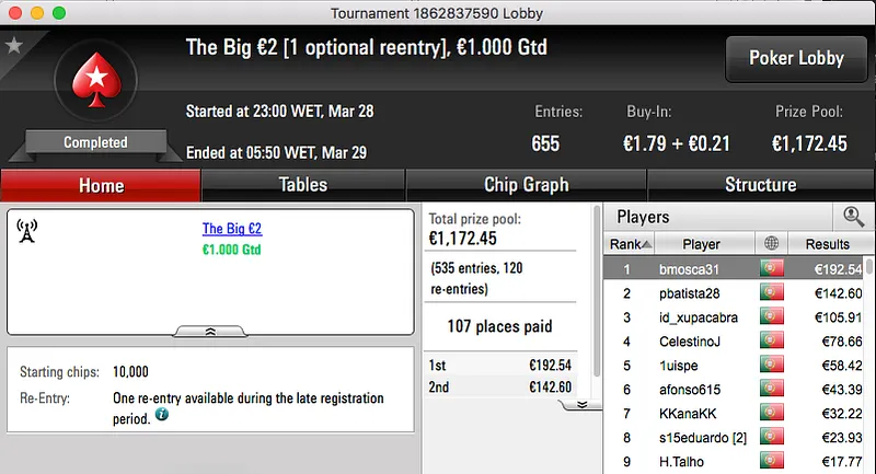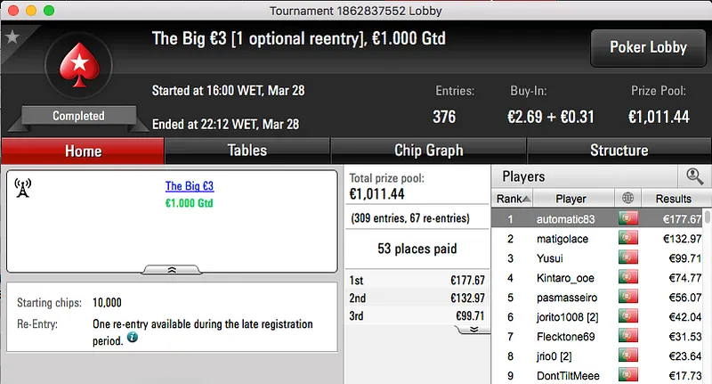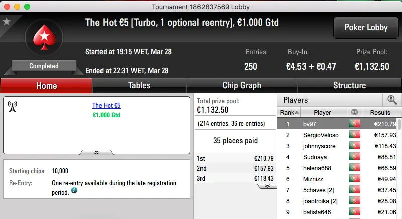 O bronze foi entregue a zyggmund (€1,232) que levou de vencidos os 852 jogadores que participaram no Super Tuesday Big €10.