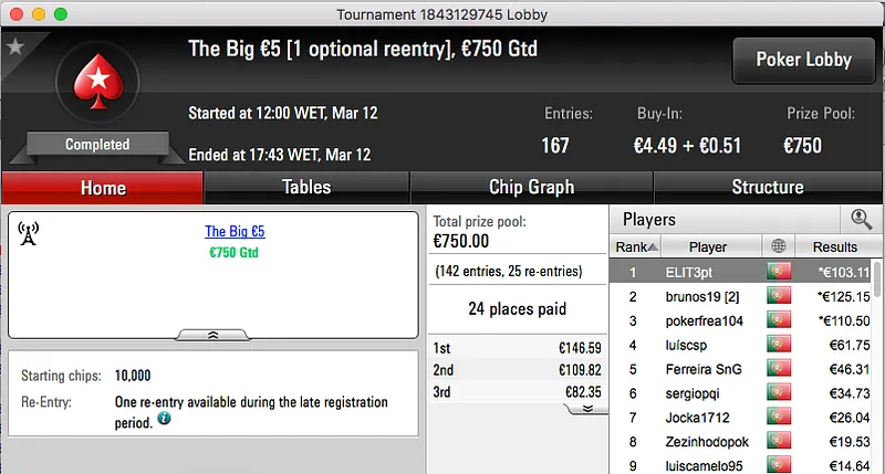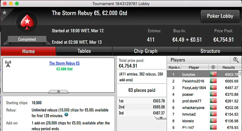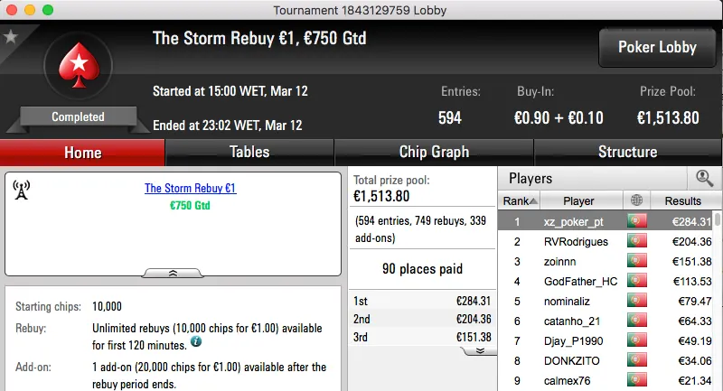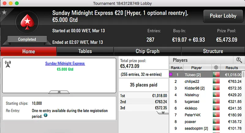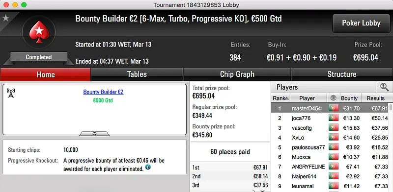Mais uma sessão de domingo e mais prémios interessantes a ser entregues pela PokerStars.pt. O maior da sessão foi o que coube ao vencedor do Sunday Battle €30, TORNAD0TONI. Entre prize pool e bounties foram €2,117 que voaram para a sua conta.