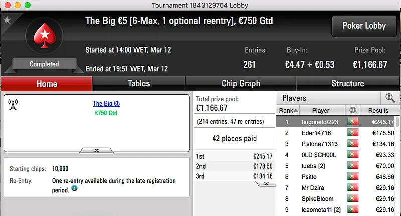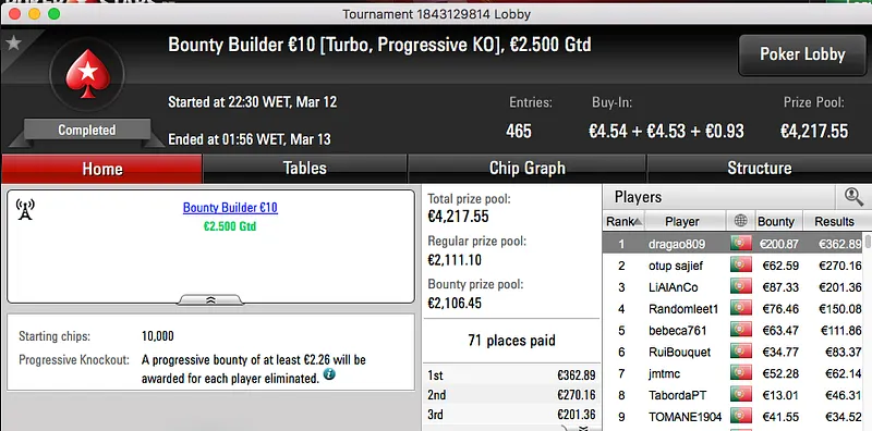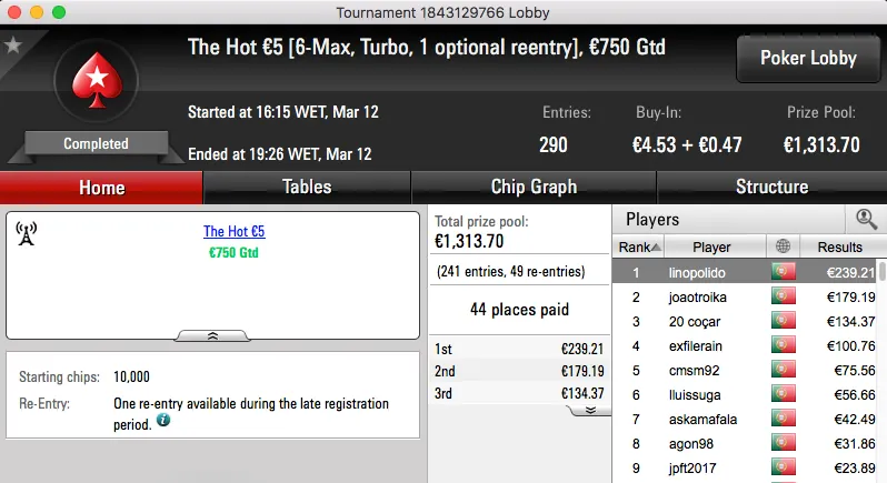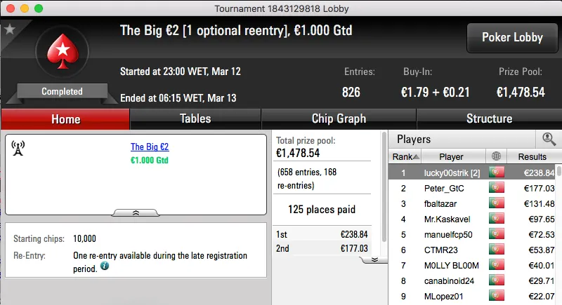 Logo atrás aparece o vencedor do The Hot BigStack Turbo €50, BrPe bateu Marco "TiJoao" Ferreira (€1,465) no heads-up e juntou €2,106 à sua banca.