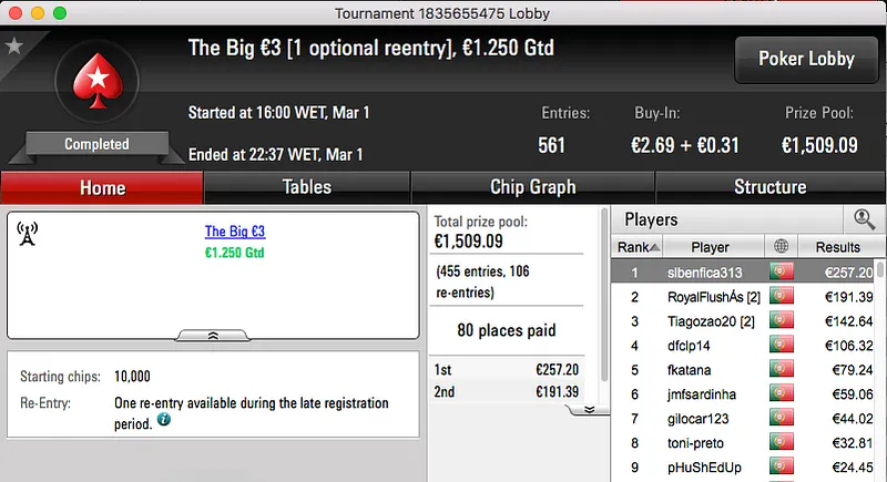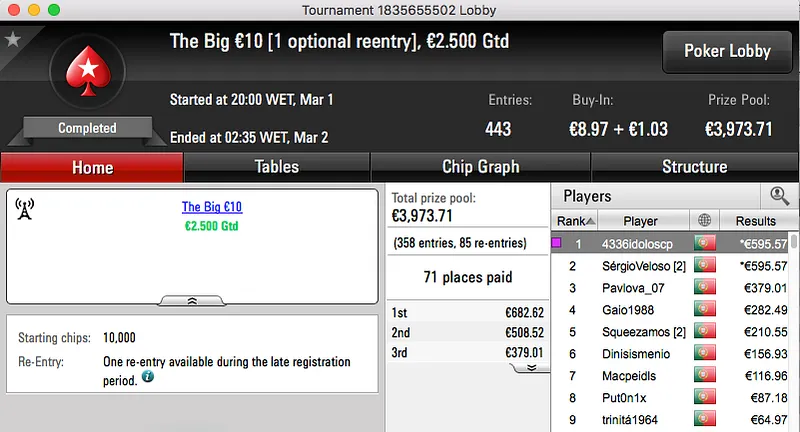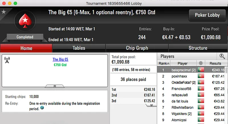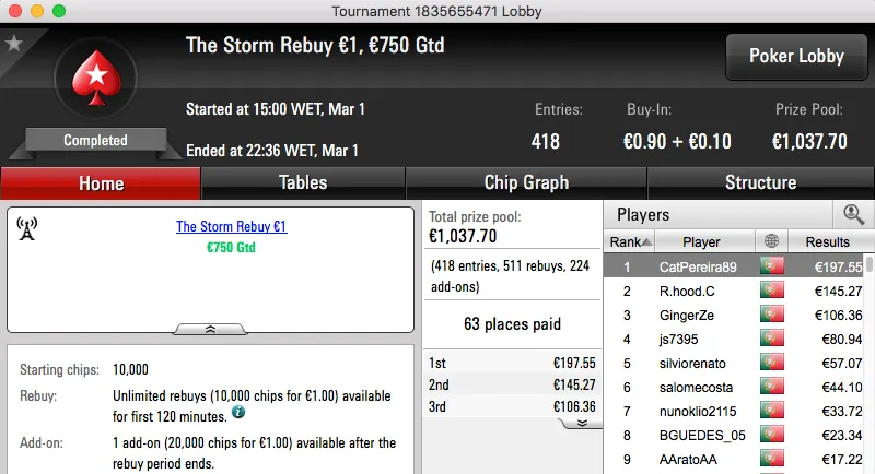 Depois de bater Rui Bouquet (€1,102) em heads-up, verycute123 recebeu €1,599.
