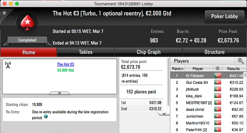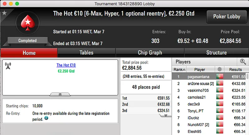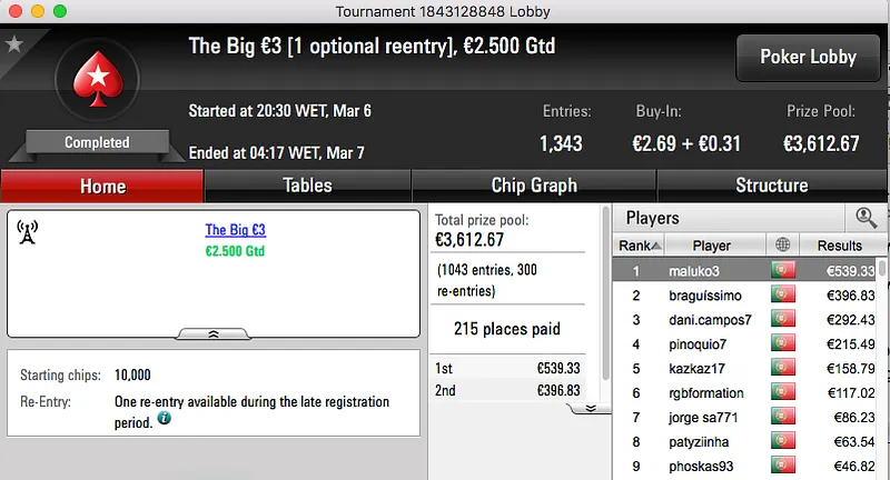 O outro torneio de domingo a terminar ontem foi o Sunday Storm €10 e a vitória final ficou com Birilu (€2,148) que bateu Valdo "NOFEAR2500" Gamito (€1,574) no heads-up.