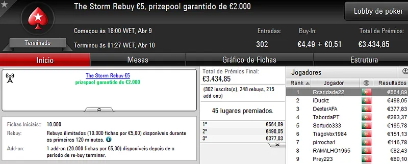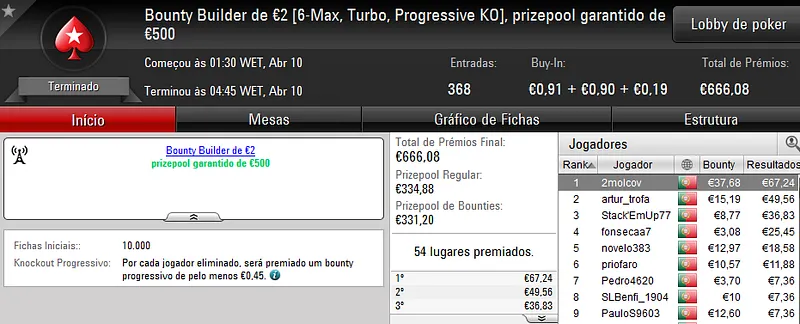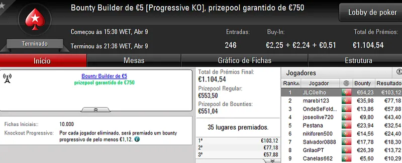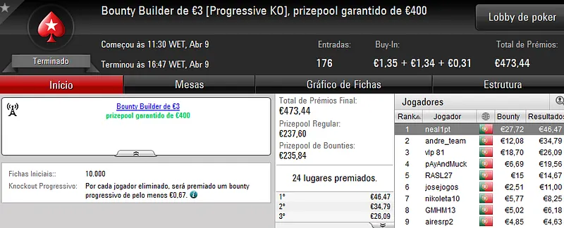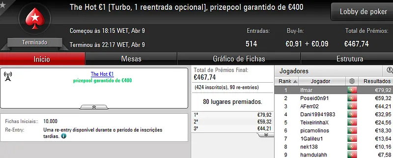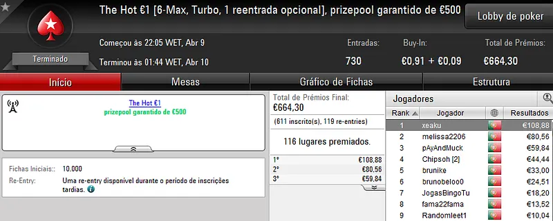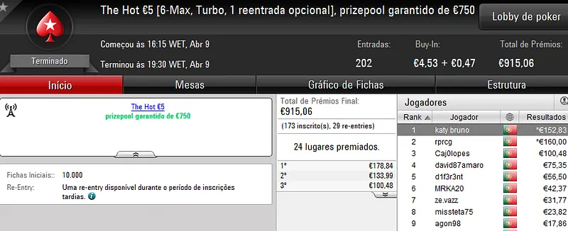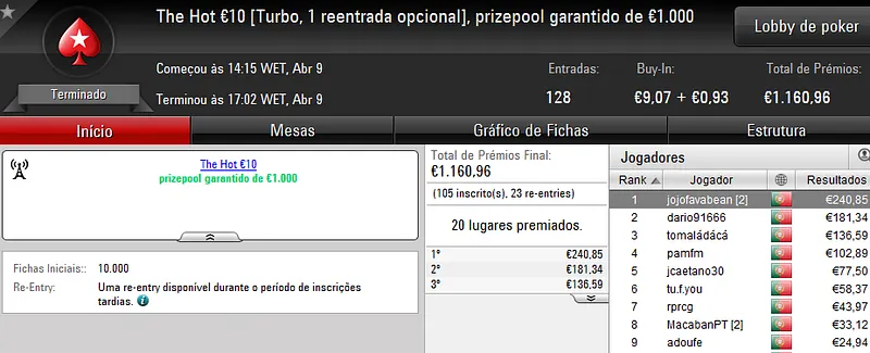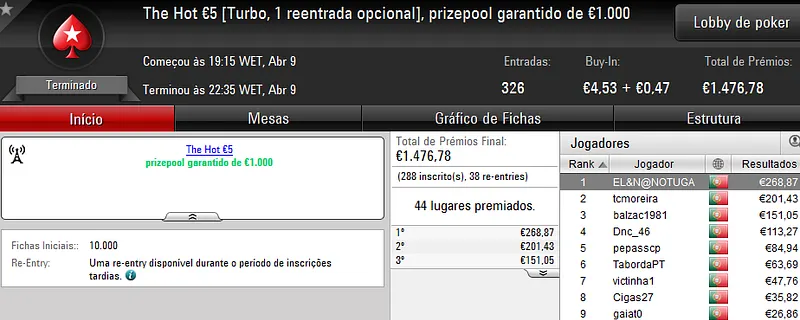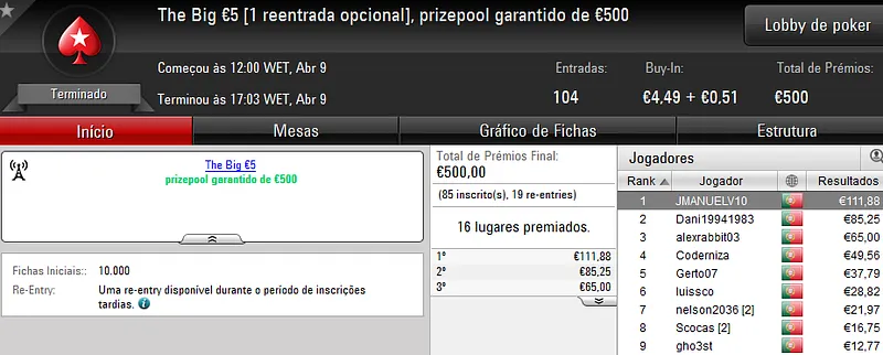 Este torneio foi mais concorrido que nos dias normais e chegou às 178 entradas que perfizeram €8,068 de prize pool. Quem levou a maior fatia foi "almfaria" que recebeu €1,856 depois de se sagrar campeão. Na segunda posição, "BgdSPT" arrecadou ainda €1,290, enquanto que o terceiro lugar do pódio ficou a cargo de "GeneraPatton" que levou €968.