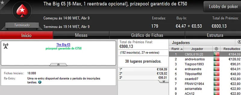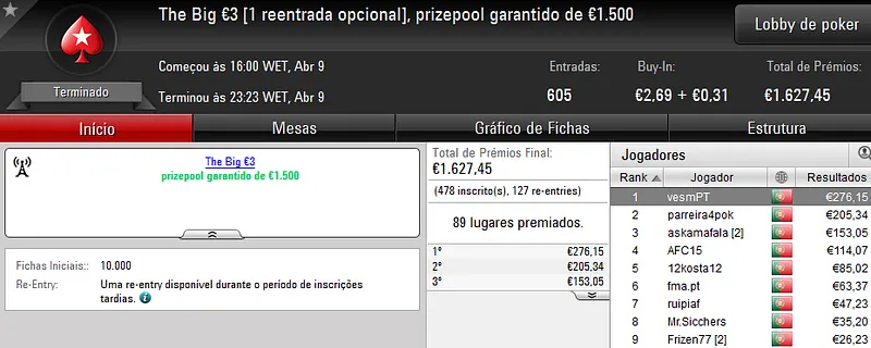 O The Big €20 contou com 326 entradas e o prize pool chegou aos €5,851. No topo da classificação, "teddy_urso09" recebeu €1,064 de prémio.