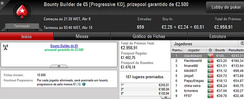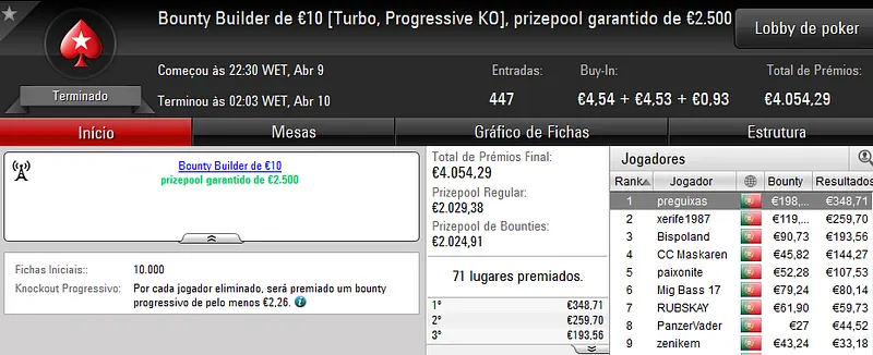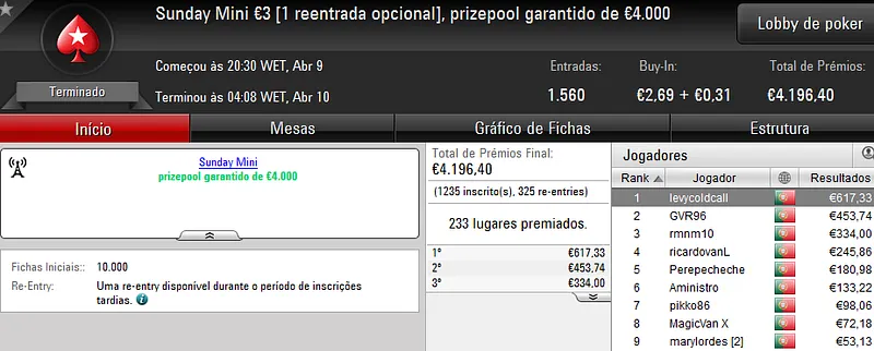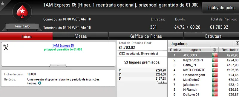 Já no Sunday Midnight Express €20, foi "Sr.motim" a arrecadar €1,018 pelo primeiro lugar.