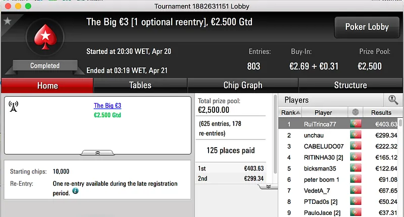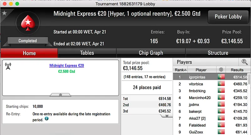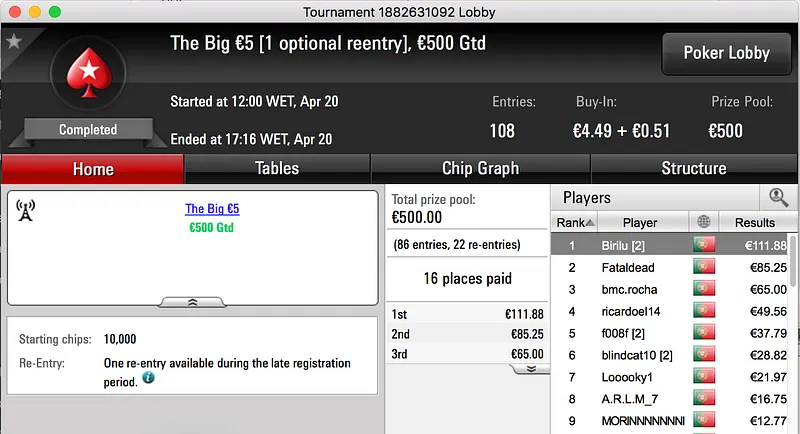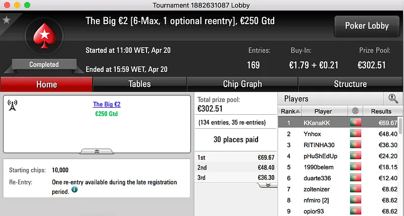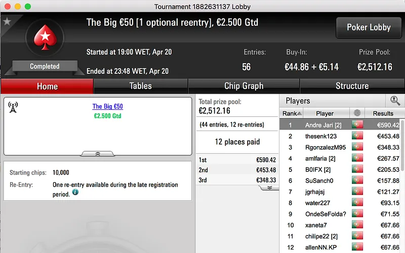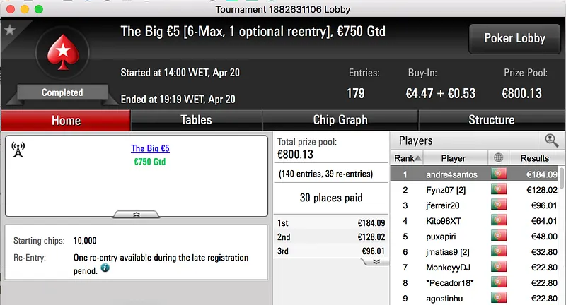 A sessão de quinta-feira terminou com amlfaria a vencer o The Big €100 e embolsar o maior prémio do dia. A vitória heads-up sobre LTLT@PT (€924) rendeu €1,386.