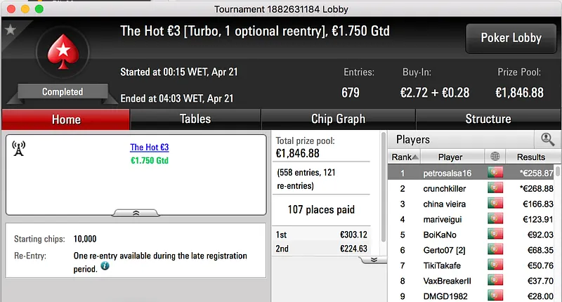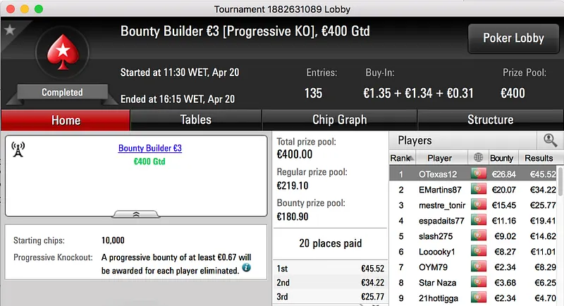 O bronze foi entregue a hugo_fcp, o nortenho bateu JMPomba no heads-up do Bounty Builder €30 e ficou com mais €912 na sua conta da PokerStars.pt.