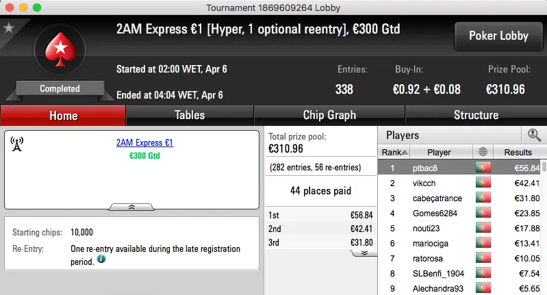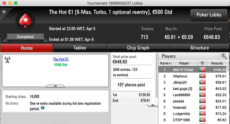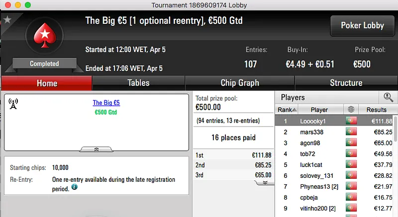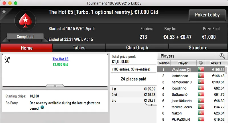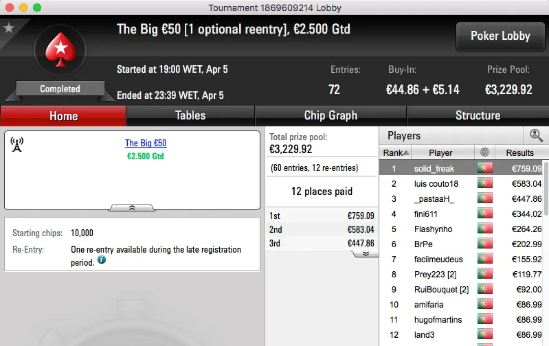 A sessão de torneios regulares desta quarta-feira, 5 de Abril, terminou com o madeirense André "galatrixo" Pereira a ficar com o maior prémio atribuído. André bateu CallMePness (€1,095) no heads-up do The Hot BigStack Turbo €50 e juntou €1,588 à sua conta da PokerStars.pt.