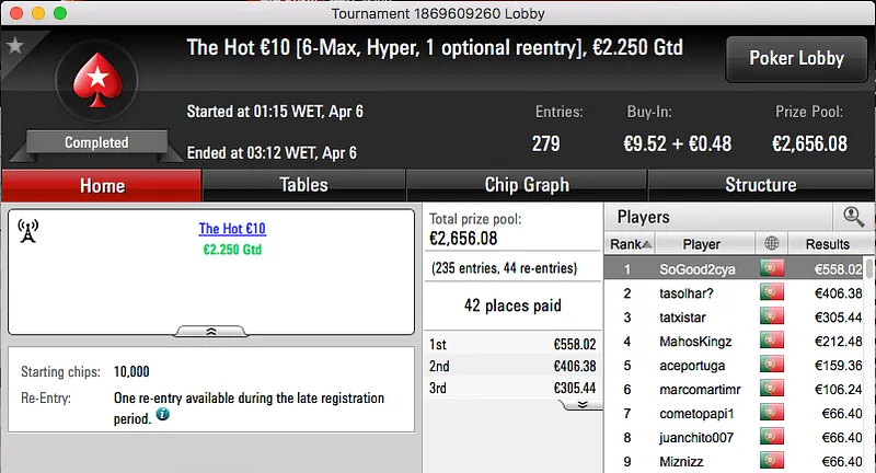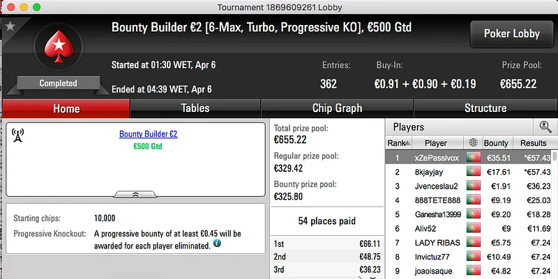 A prata da sessão foi para Viseu, 123bombaaaaa venceu o Bounty Builder €30 e somou mais €1,104.