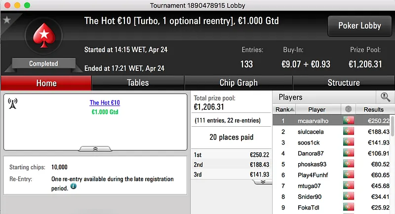 A prata foi entregue a mazeltov1 (€1,123) depois de chegar a acordo heads-up contra diogo80155 (€1,104).