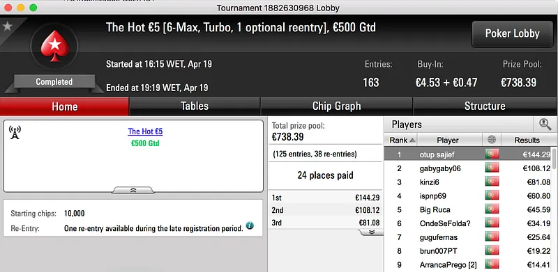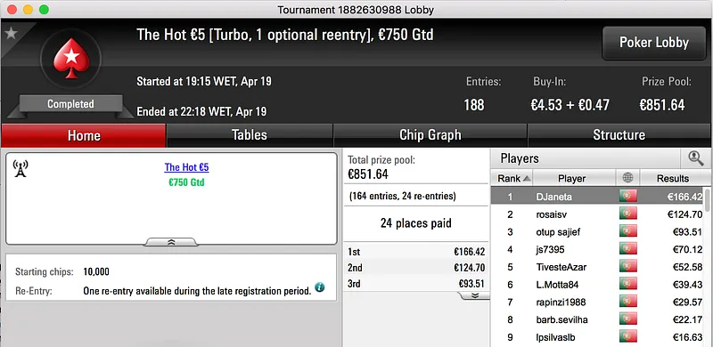 A sessão de quarta-feira voltou a ver o The Hot BigStack Turbo €50 entregar o maior prémio da noite. O melhor dos 105 jogadores em prova foi juanchito007, bateu VASSA (€875) em heads-up e juntou €1,300 à sua banca da PokerStars.pt.
