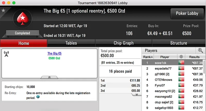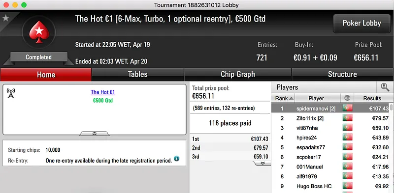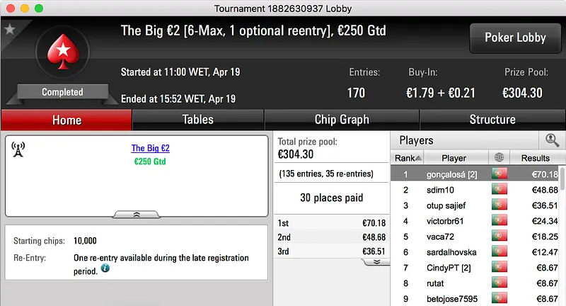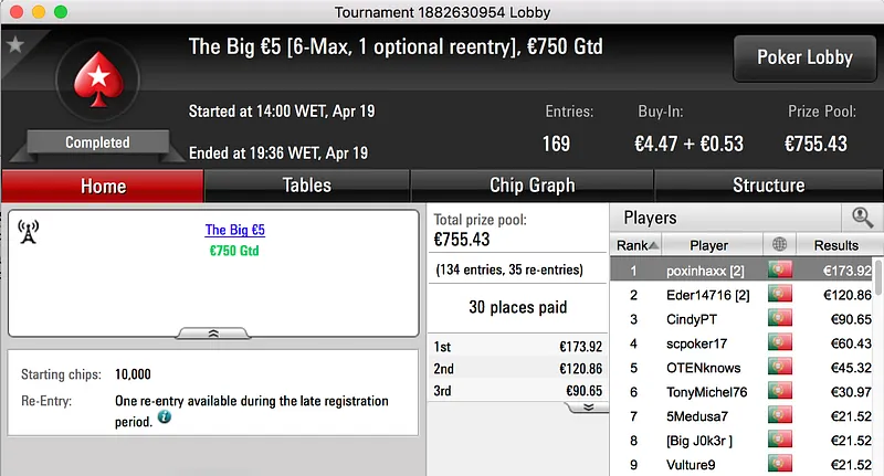 A prata ficou para Vitor "chilipe22" Abreu, venceu o The Big €100 e tem agora mais €1,278 na conta.