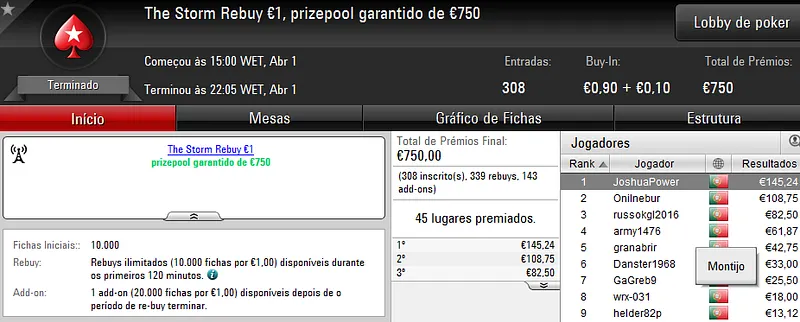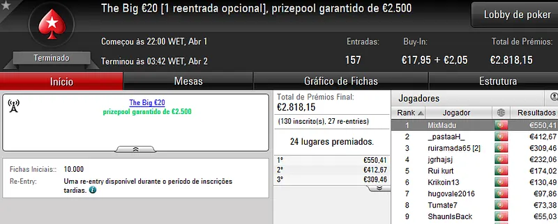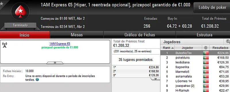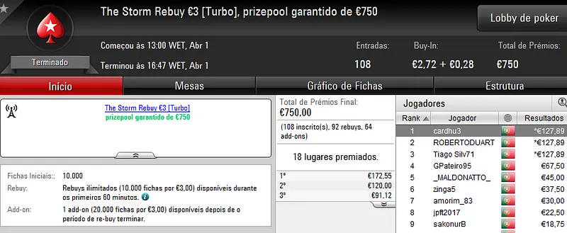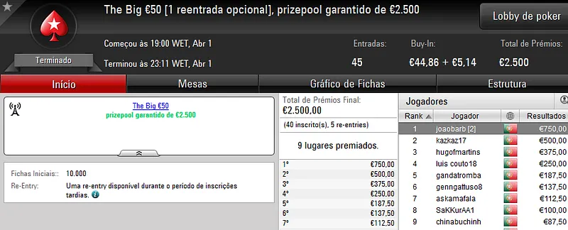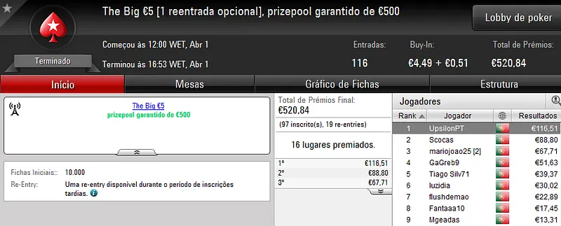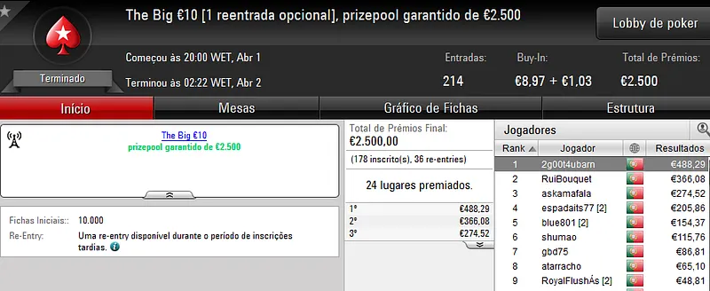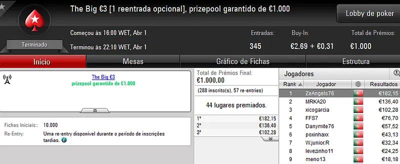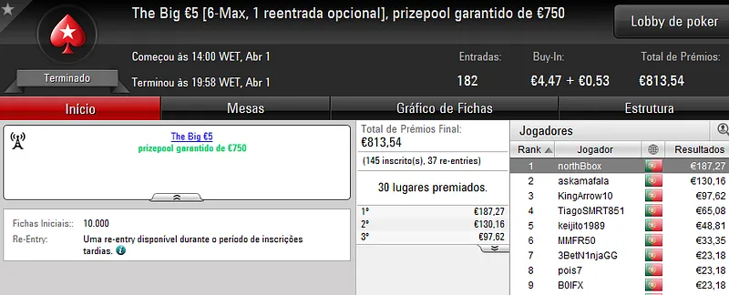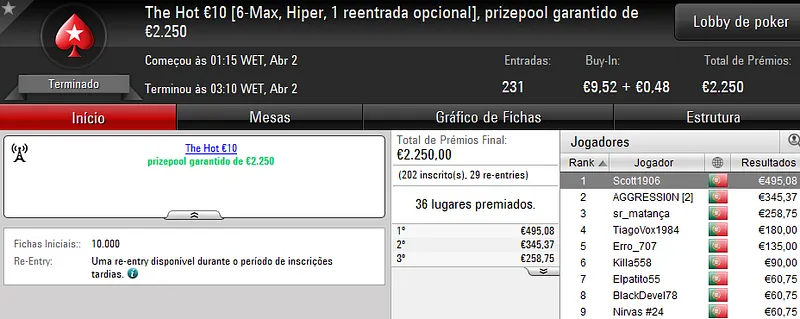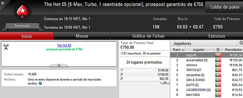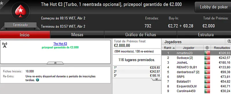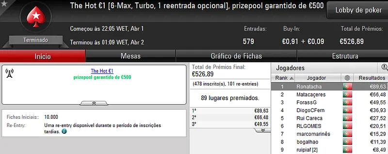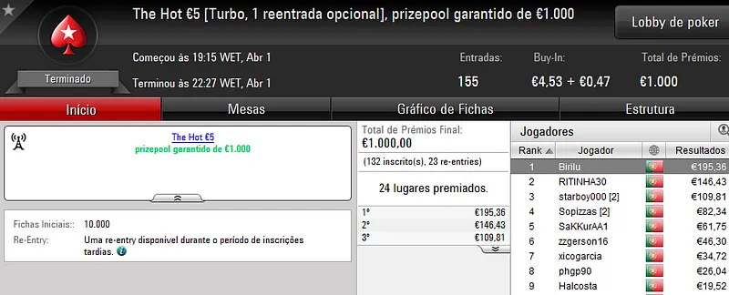 Tal como aconteceu ontem, esse resultado veio no The Hot BigStack Turbo €50. Este torneio contou com a participação de 80 jogadores que perfizeram 97 entradas, fazendo assim o prize pool chegar aos €4,397.