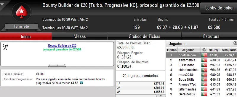 "killercooky" foi o campeão e arrecadou o maior prémio da noite, €1,143, depois de vencer "EL&L@NOTUGA" no heads-up (€769).