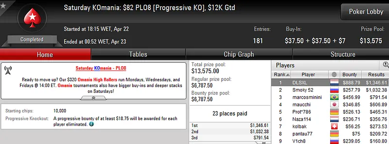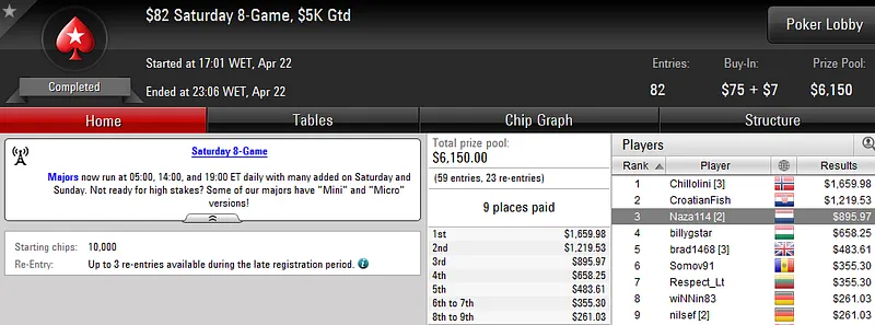 Sendo quase impossível para nós acompanharmos tamanho grind, deixamos aqui alguns dos resultados que Naza114. Fica a dúvida no ar. Quanto amealhou o jogador madeirense nesta sessão?