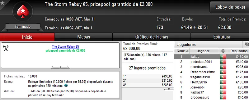A vitória pertenceu a "Peixinho2016" que arrecadou €1,272 de prémio, após vencer "Squeezamos" no heads up (€856). Destaque ainda para "Killa558" que terminou em terceiro e recebeu €636, e para olhanense "SuSanch0" que encaixou €416 em quarto.