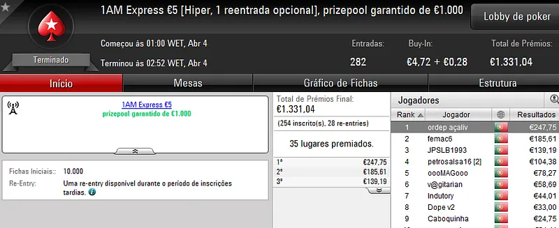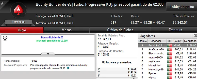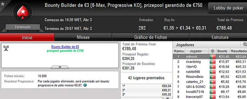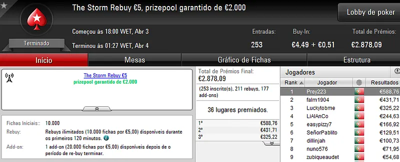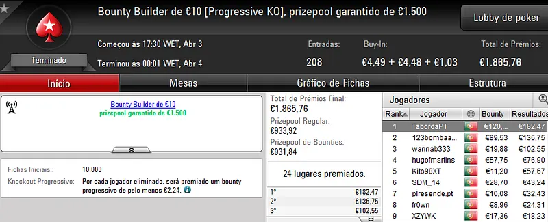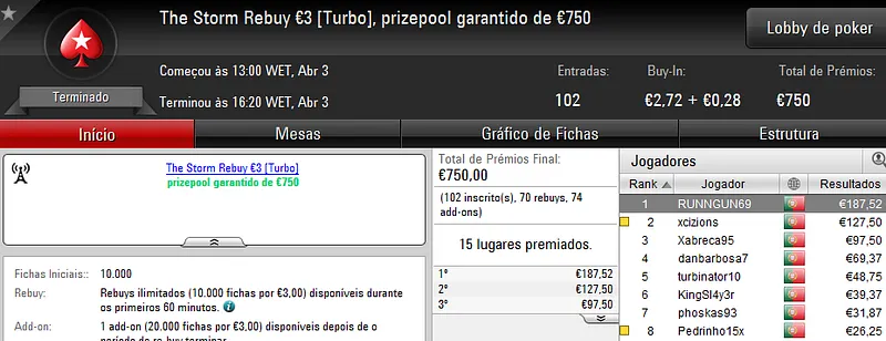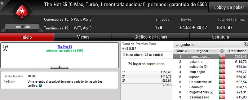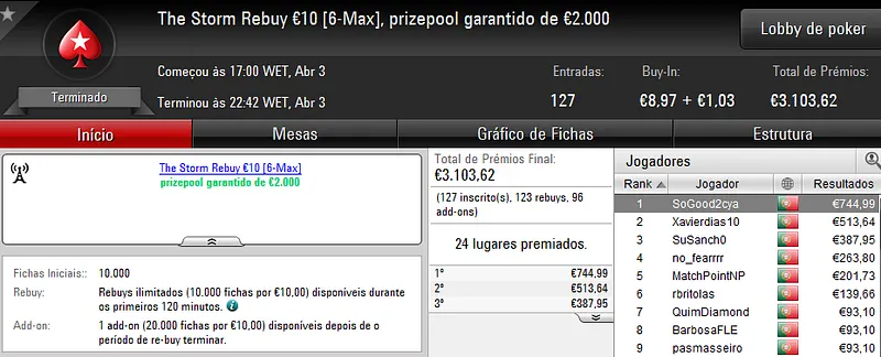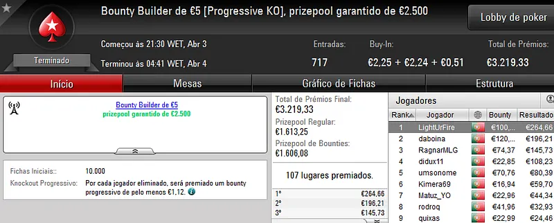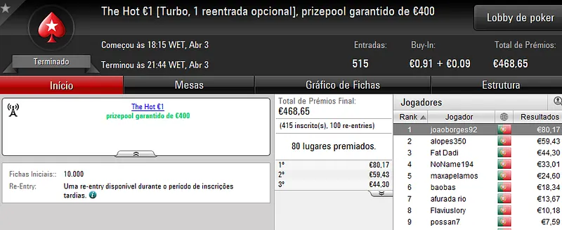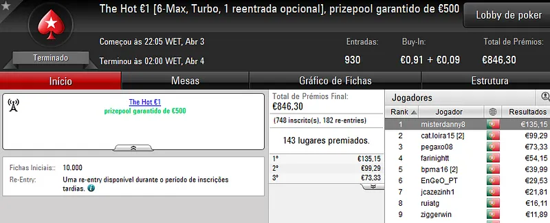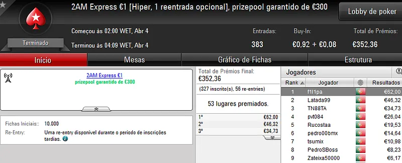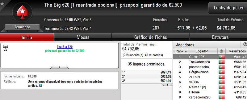 Já no The Big €50 com 96 entradas e €4,306 de prize pool, "askamafala" fez bom uso da segunda entrada e levou o título. Para a história ficam os €940 ganhos depois de fazer acordo com "TonyMichel76" no heads-up que recebeu €849. No tercerio lugar, "Pufadinha" amealhou €597 de prémio.