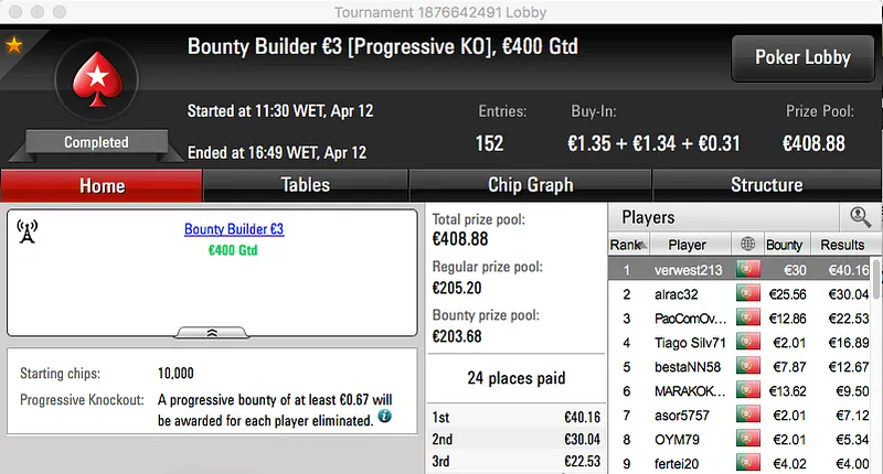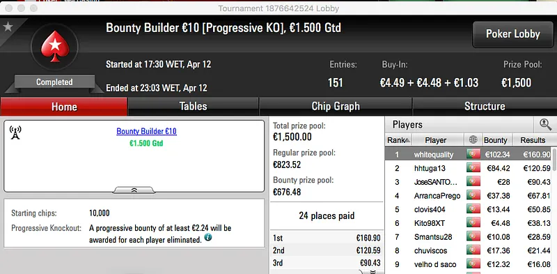 Por último, catanho_21 ficou com o bronze depois de vencer o Bounty Builder €30 (€713).