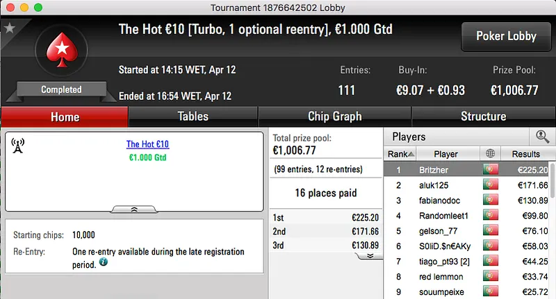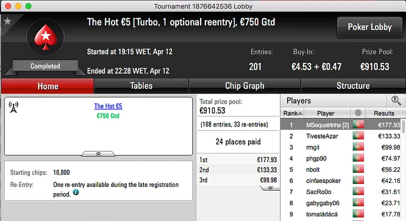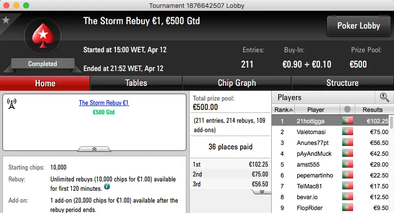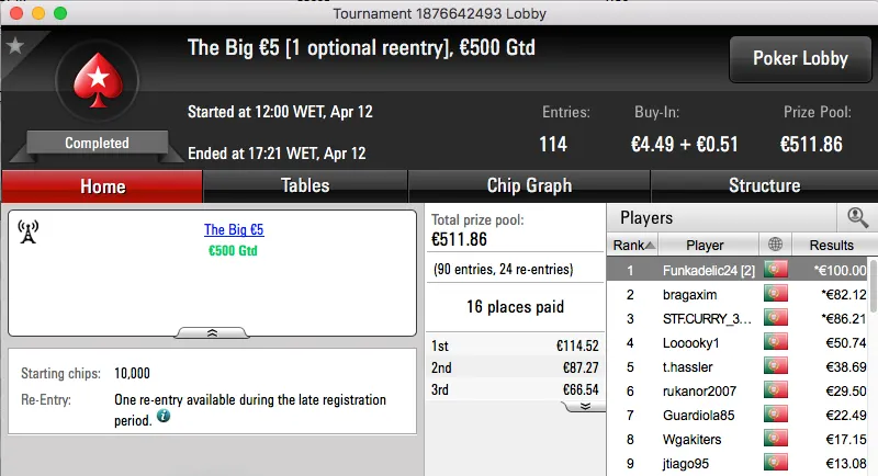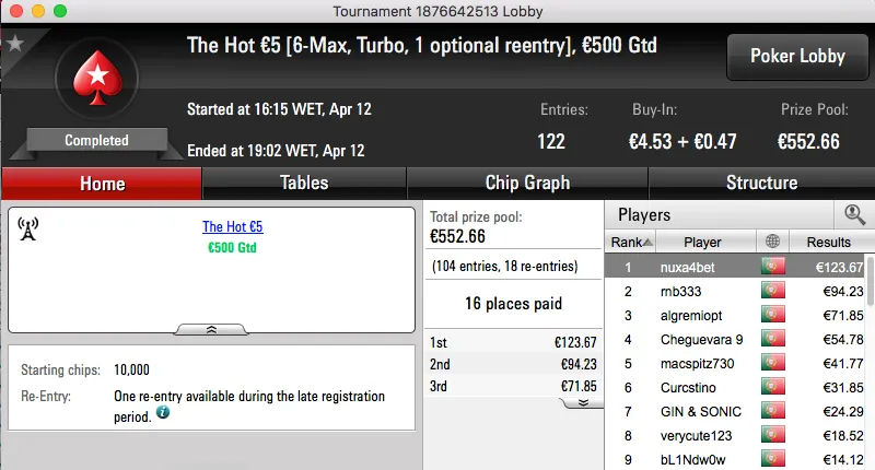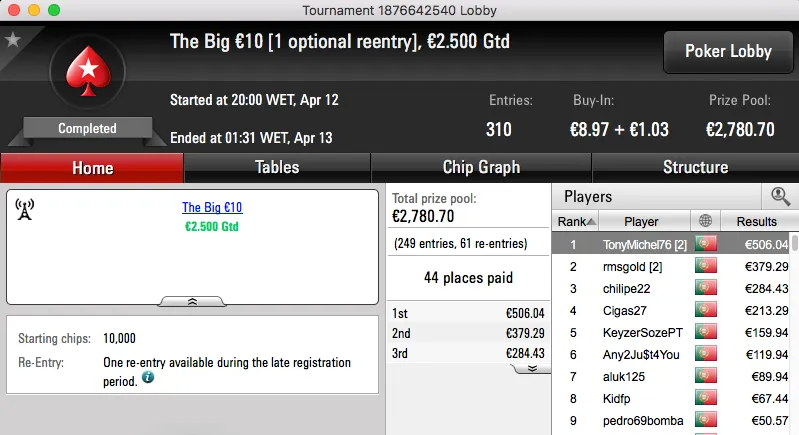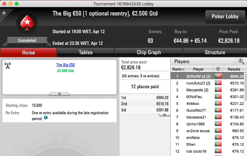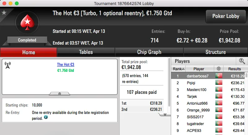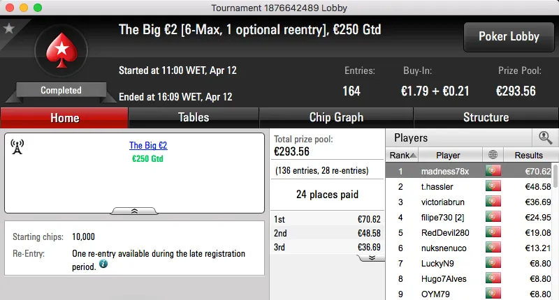 A sessão de quarta-feira terminou com o Rui obisgas Gabriel a fica com o maior prémio entregue na PokerStars.pt. A vitória sobre André "galatrixo" Pereira (€906) no heads-up do The Big €100 valeu €1,359.