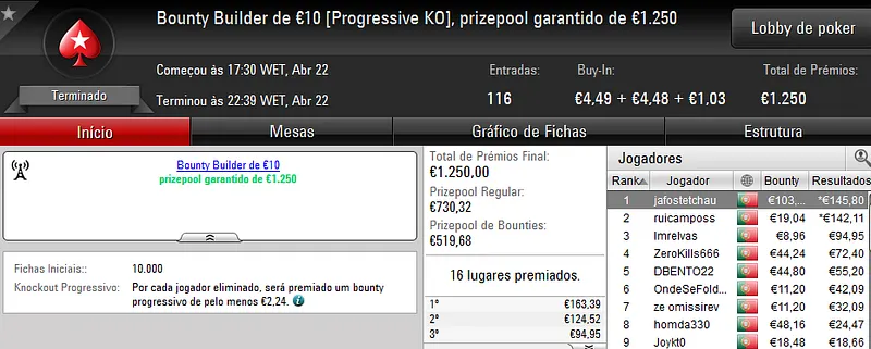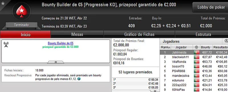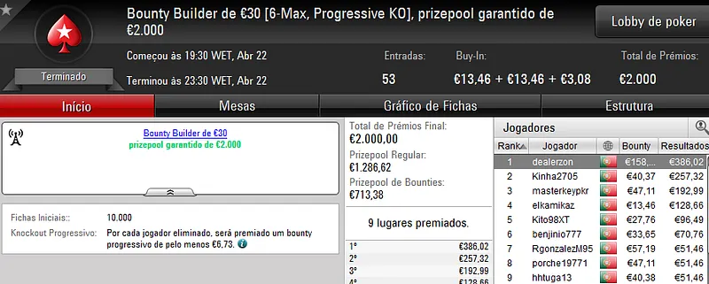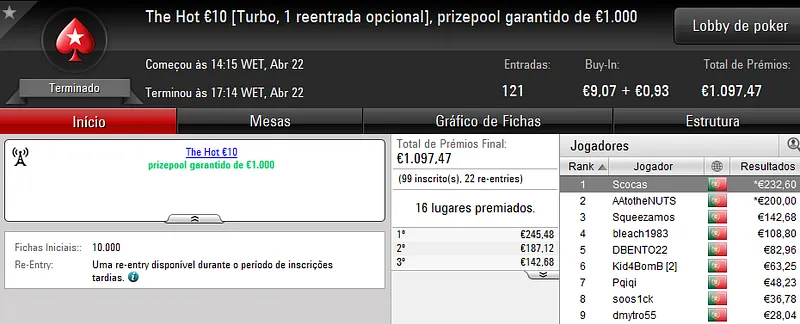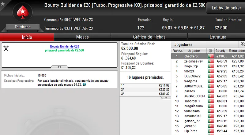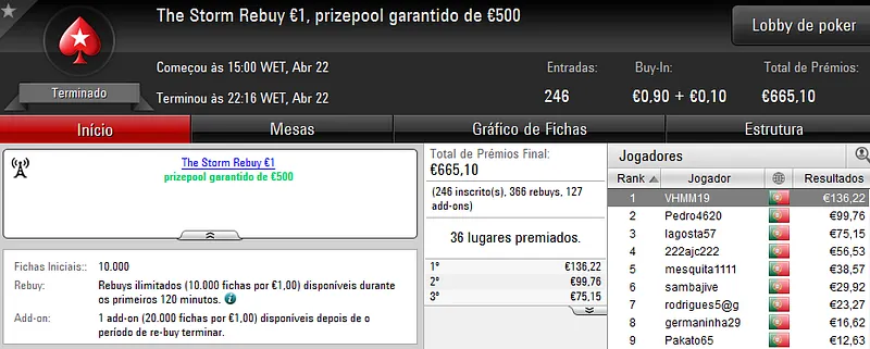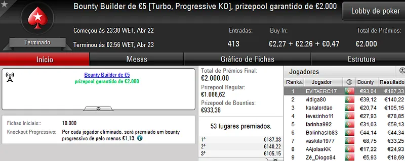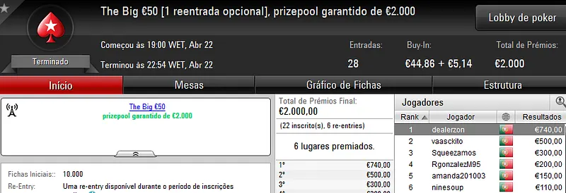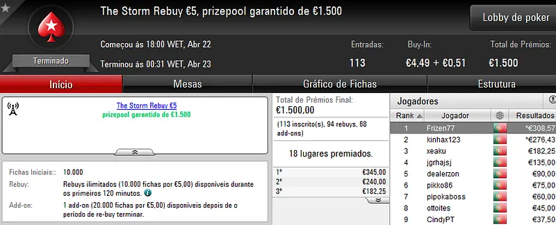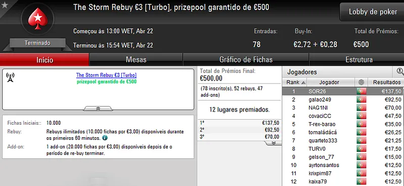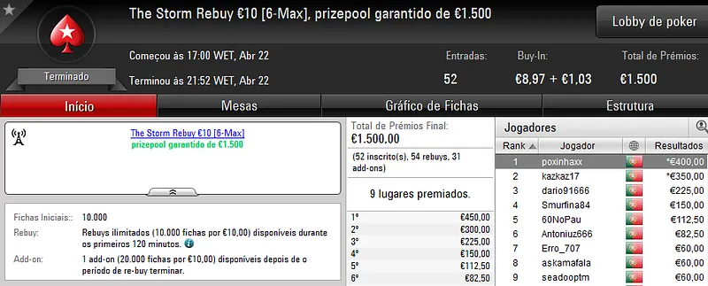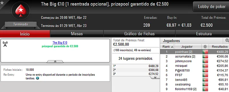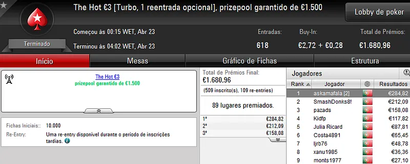 A sessão de sábado na PokerStars.pt costuma ser fraquinha em termos de números de jogadores e ontem não foi excepção. Apenas registamos um resultado de 4 dígitos.