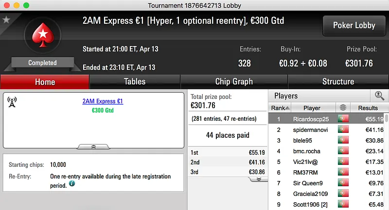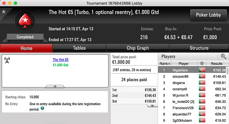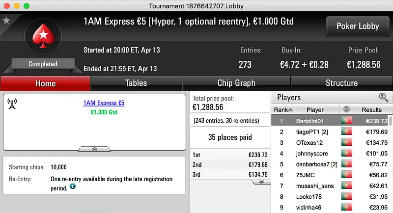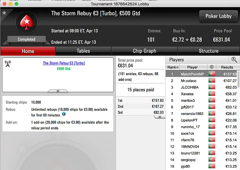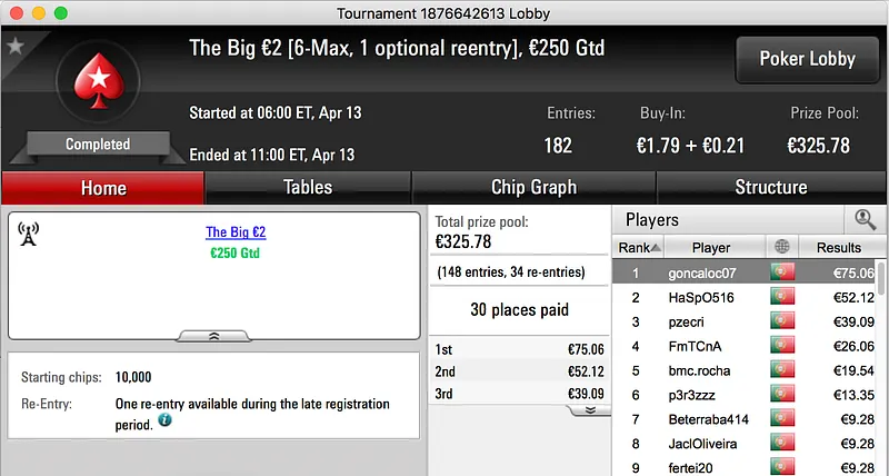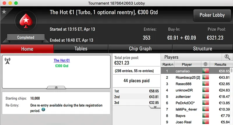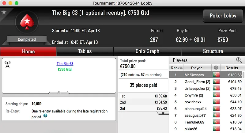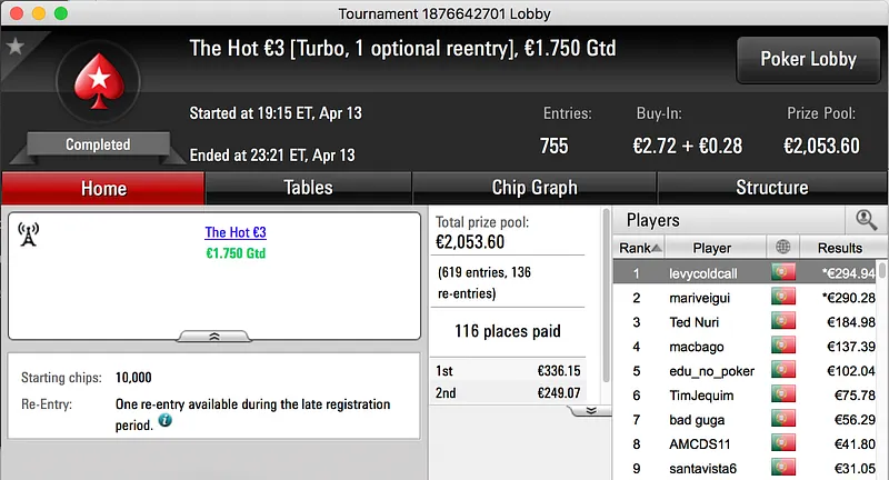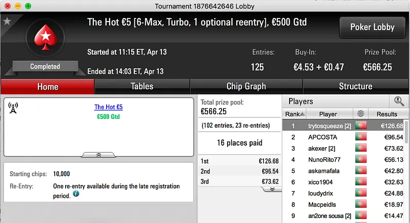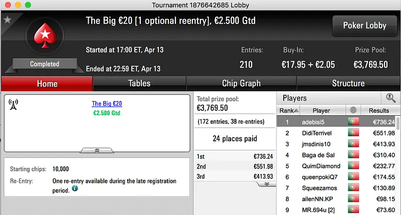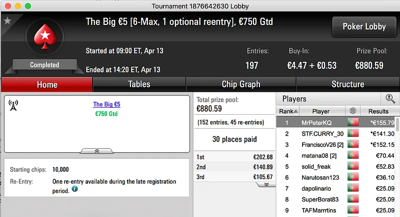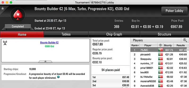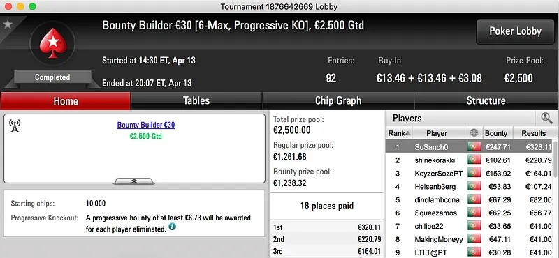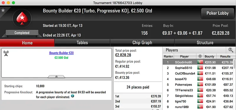 Por último, fechamos o pódio com a vitória de SuSancho no Bounty Builder €30, foram mais €823 a voar para a sua conta.