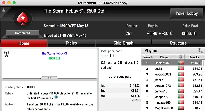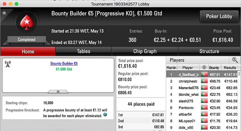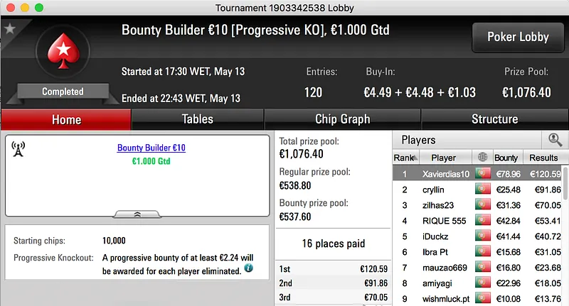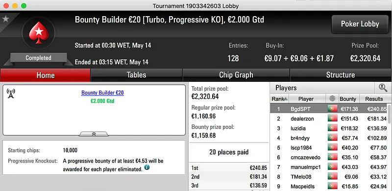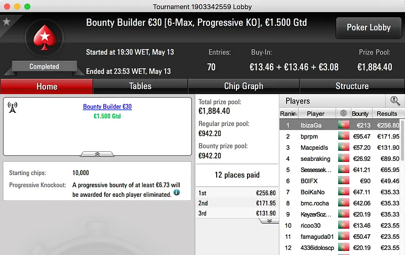 O pódio encerra com a vitória de IbizaGa no Bounty Builder €30 que lhe valeu €682.