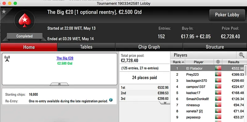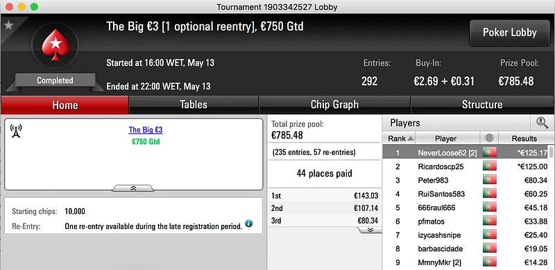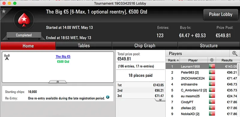 Prey223 foi o maior vencedor da sessão de sábado da PokerStars.pt. A vitória sobre seabraking (€870) no heads-up do The Big €100 rendeu €1,305.