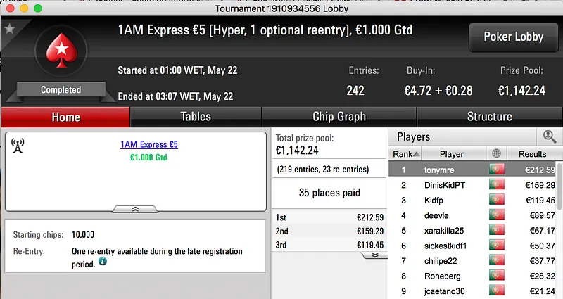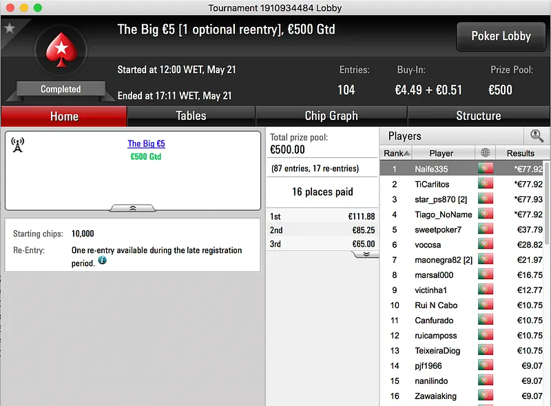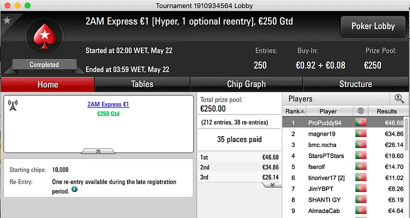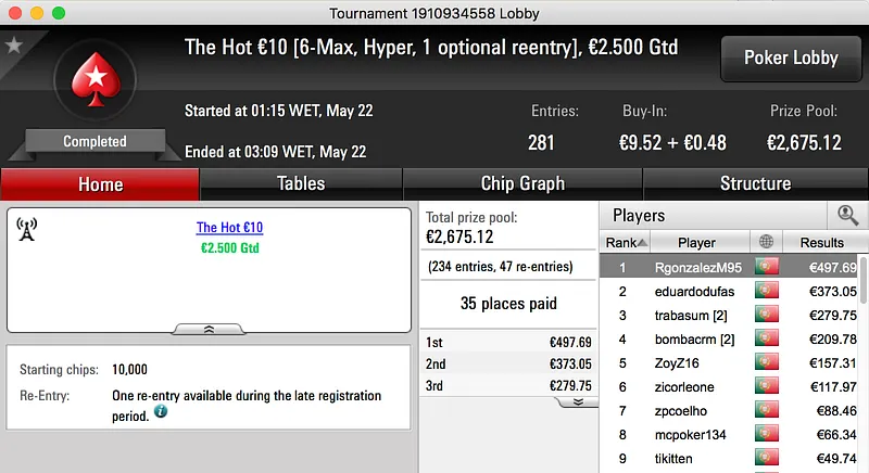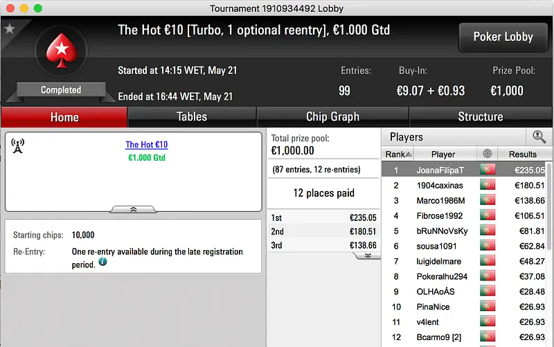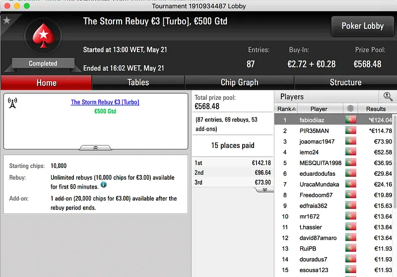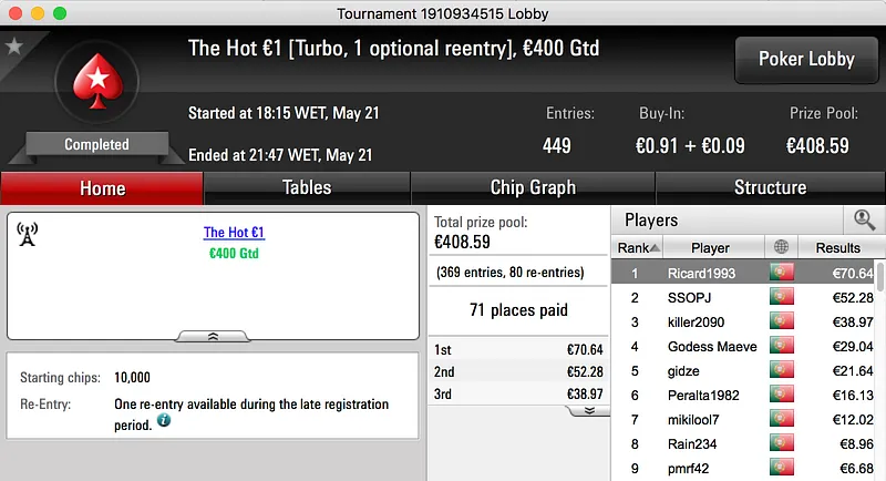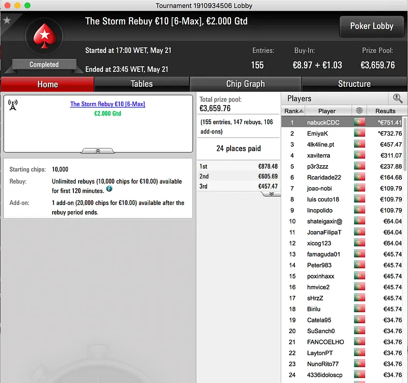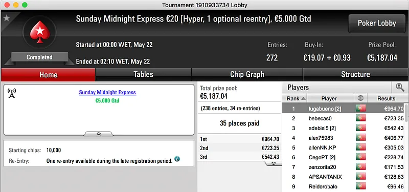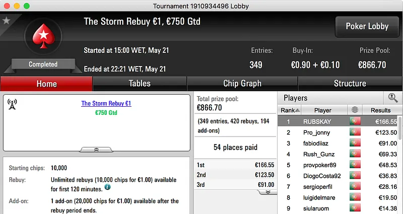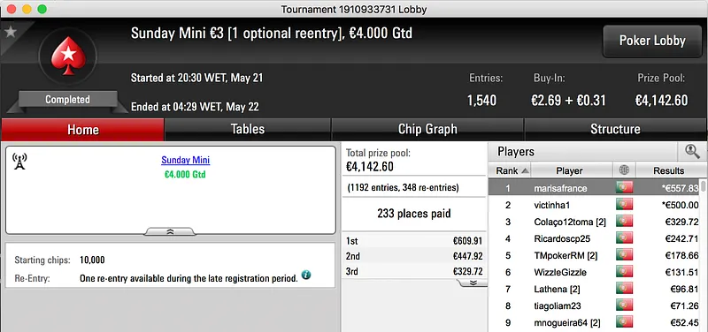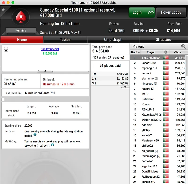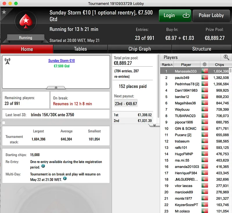 No dia de hoje vão-se resolver o Sunday Storm €10 e o Sunday Special €100, em jogo estão mais de €23 mil.
