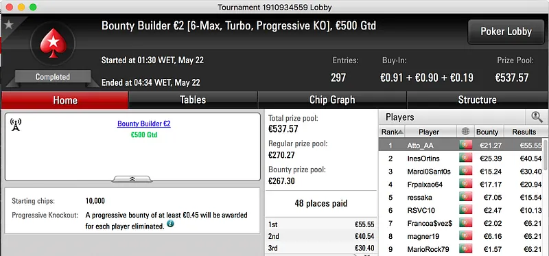 Poucas dezenas de euros separam hoje a prata do bronze e o mesmo fica para Salmitok, venceu o Sunday Battle €30 e tem mais €1,646 na sua banca.