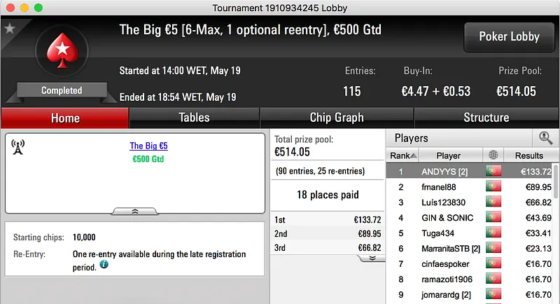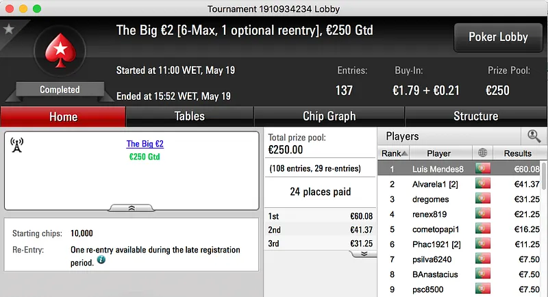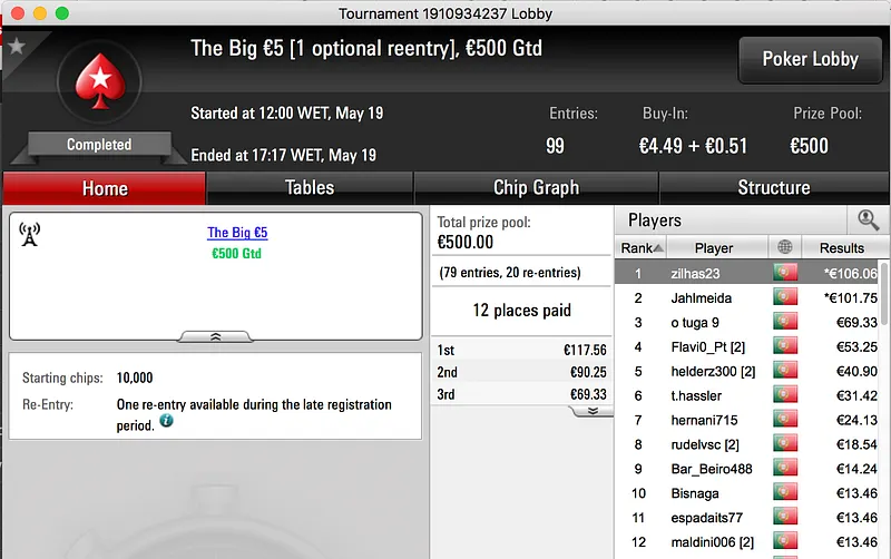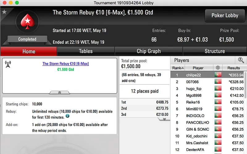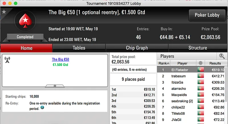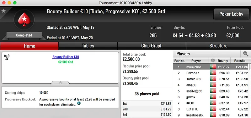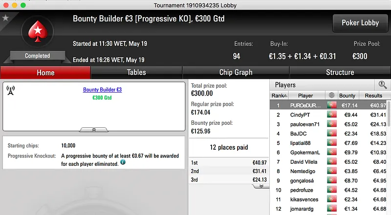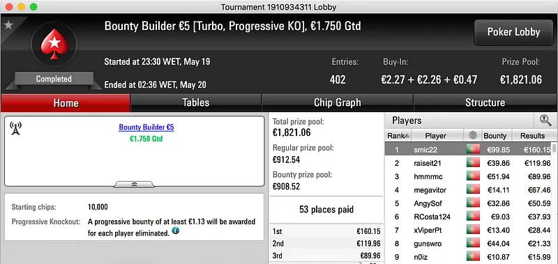 O pódio fecha com a vitória de catanho_21 no Bounty Builder €30, rendeu €816.