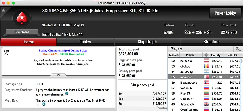 Jorge Abreu aparece hoje como líder dos 65 sobreviventes ao dia 1 do Evento #65 Medium do Spring Championship Of Online Poker da PokerStars. O torneio contou com a participação de 3,898 jogadores e a disputa de 28 níveis reduzi-os a 65.