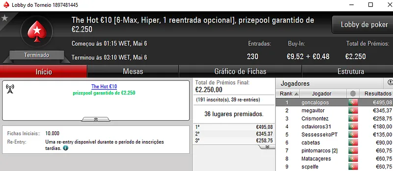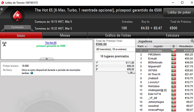 O The Hot BigStack Turbo €50 contou com 70 participantes que realizaram 15 reentradas. O prize pool ascendeu aos €3,853 e para o campeão ficaram reservados €1,001. Prémio que foi conquistado por ValterMP que fez bom uso da sua reentrada. No heads-up, ele venceu Smurfina84 que levou €674 de prémio. Na terceira posição, kakiers recebeu €500.