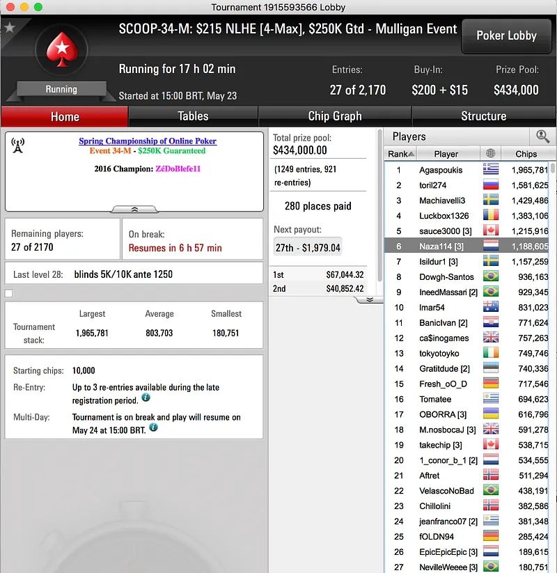 A luta de Naza114 no POY SCOOP 2017 passa também pelo dia 2 do Evento #34 Medium, o português é o sexto de 27 ainda prova e em jogo estão mais de $67 mil.