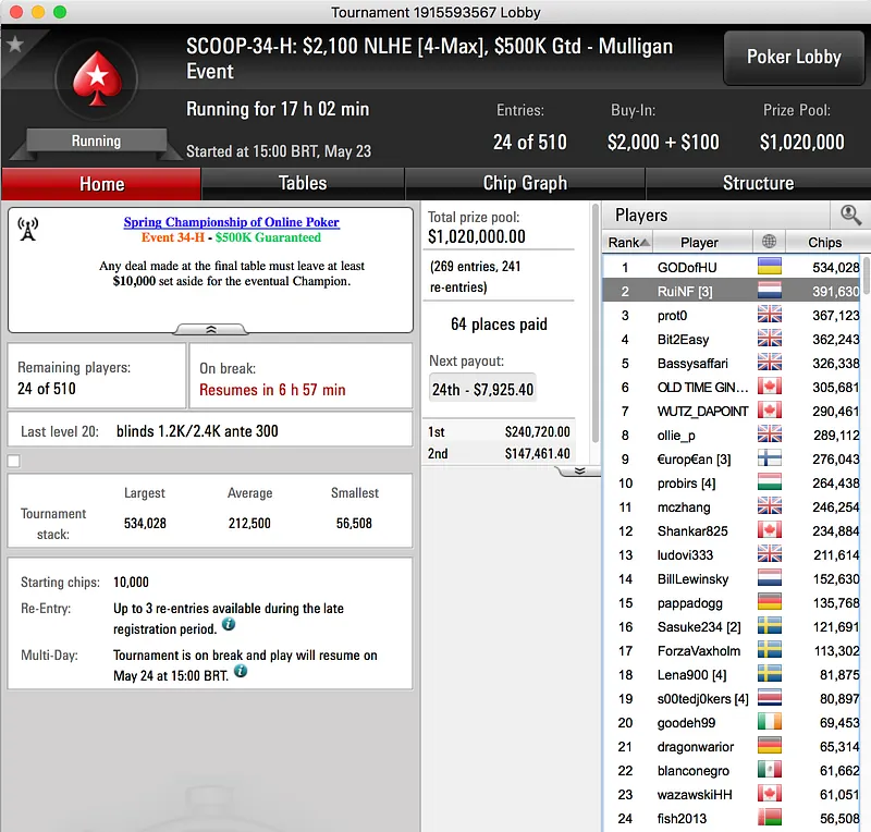 Na versão cara do #34 é RuiNF quem está em prova, a segunda maior stack é sua e em prova estão 24 jogadores. Já garantiu $7.925 e o vencedor vai encher a conta com $240.720.