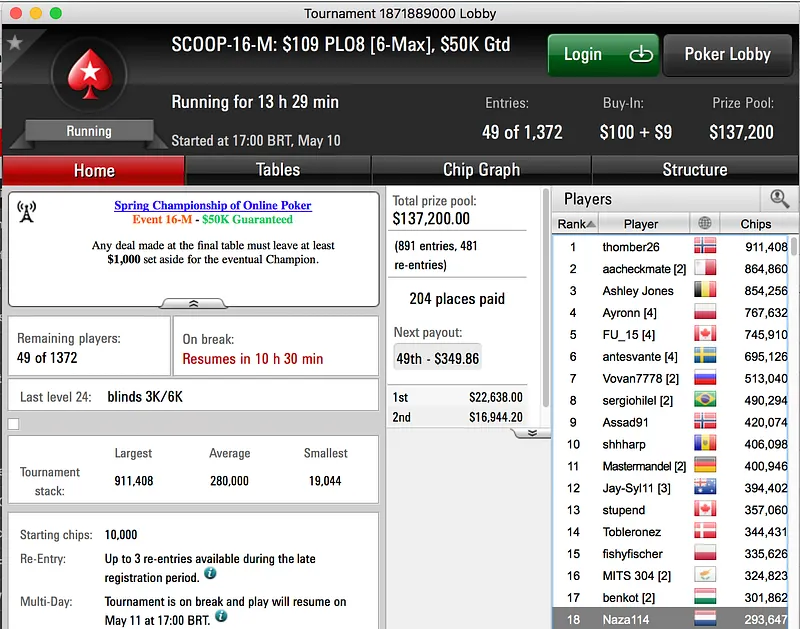 - 18/49 @ SCOOP #16-Medium, $109 Pot Limit Omaha HI/Low, com 49bb