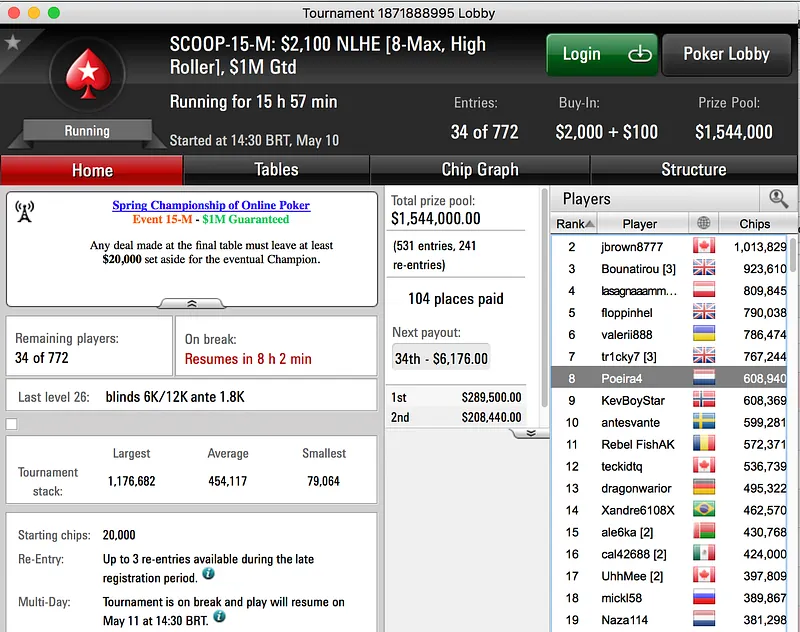 No evento #15 tem a companhia de Carlos "Poeira4" Branco, oitavo no chip count.