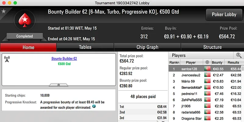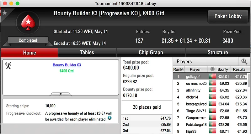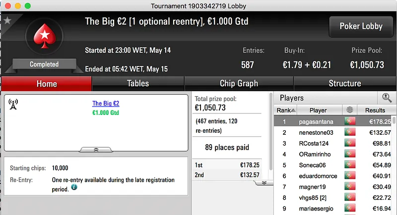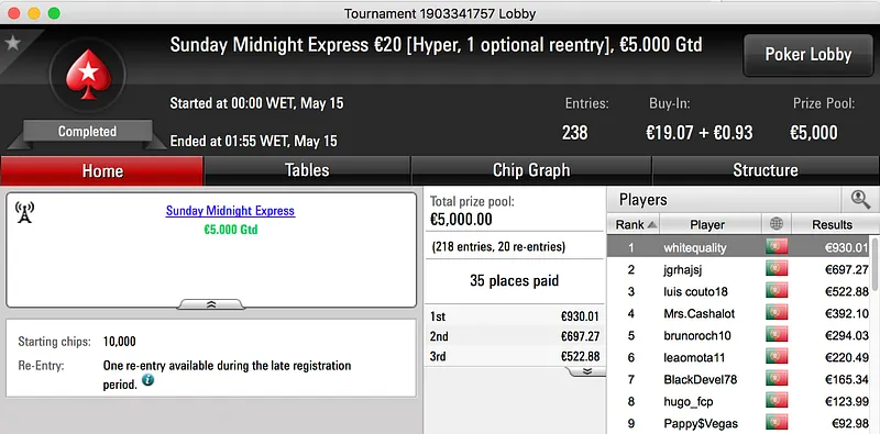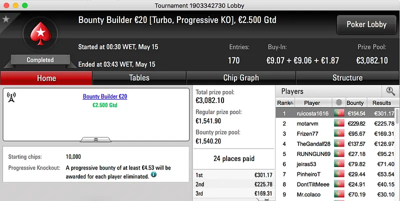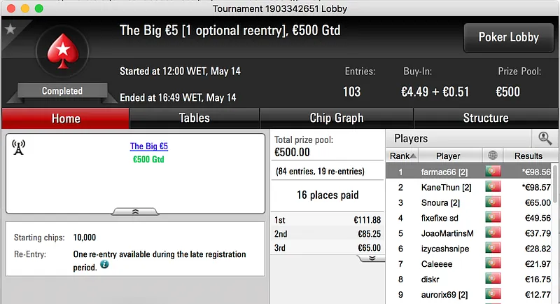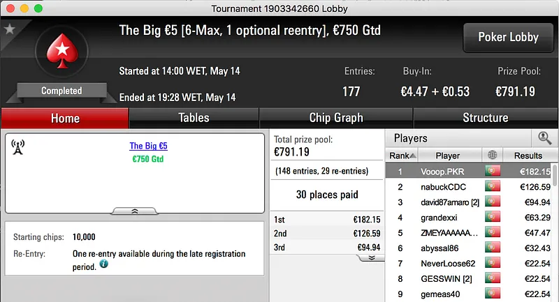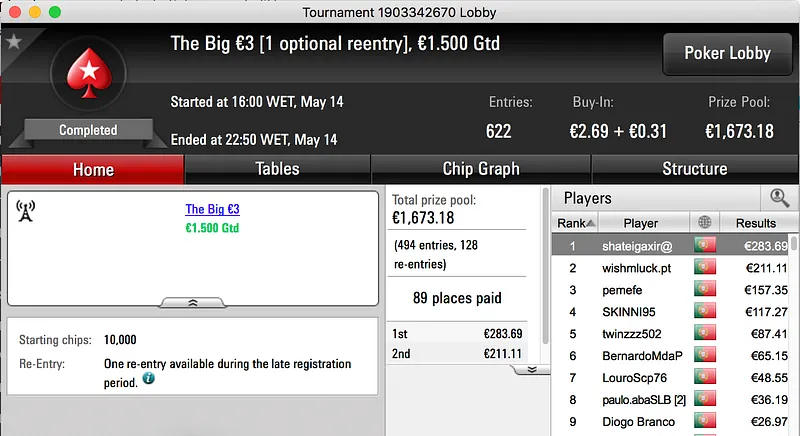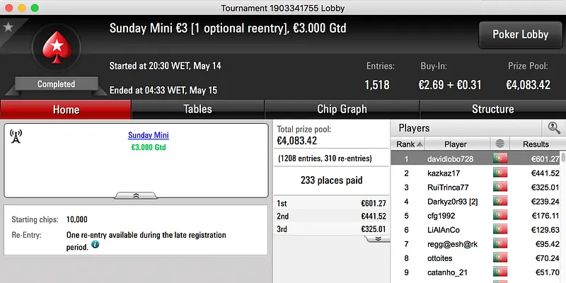 O pódio fecha com a vitória de Francisco "fdmlopes93" Lopes no Sunday Battle €30, entre prize pool e bounties o prémio chegou aos €1.457.