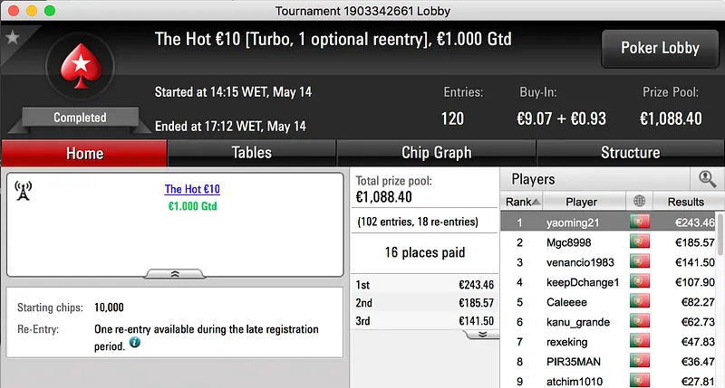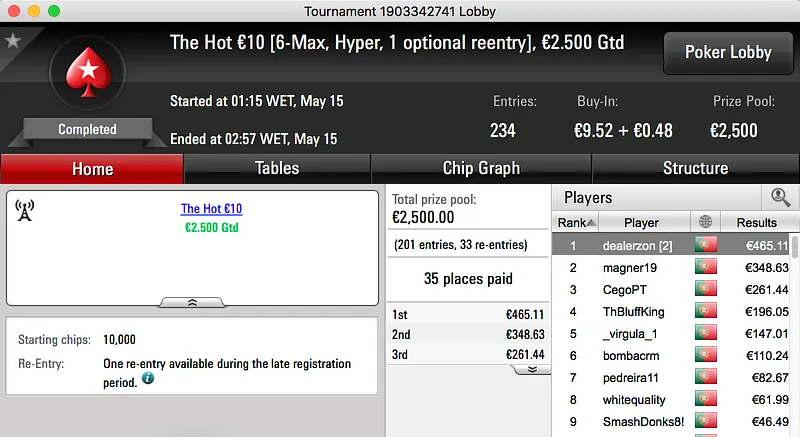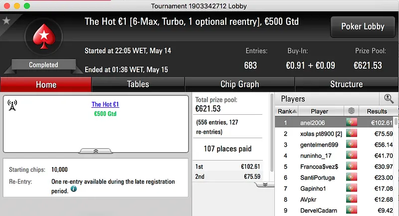 O maior prémio, já atribuído, da sessão de domingo foi ganho por Sr_motim. A vitória no The Hot BigStack Turbo €50 rendeu €1.793 e foi alcançada depois de bater SuSancho (€1.247) em heads-up.