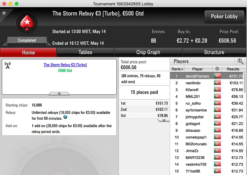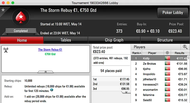 Como é hábito, a sessão de domingo faz dois dos seus torneios avançarem para a noite de segunda. Esta semana o Sunday Storm €10 contou com a participação de 1.092 jogadores e no dia 2 vão estar presentes apenas 16. A liderar está Pedro Palma Ferro com 2.658,942 fichas, bem mais que as 1.927,155 de 0LD $CH00L. O pódio fecha com a presença de marsal000 (1.728.245) e todos já têm garantido um prémio mínimo de €72.13, a vitória vale €1.504.