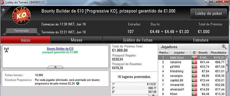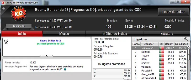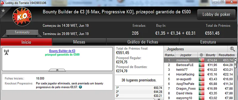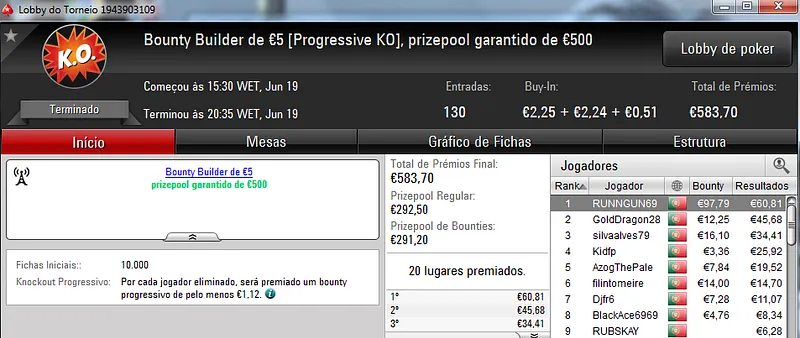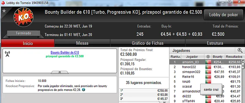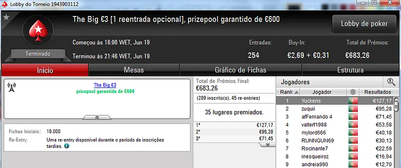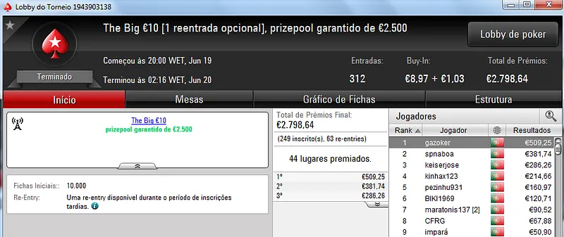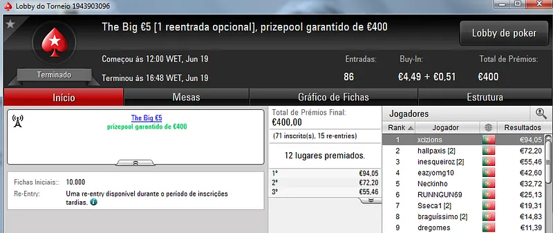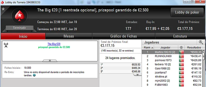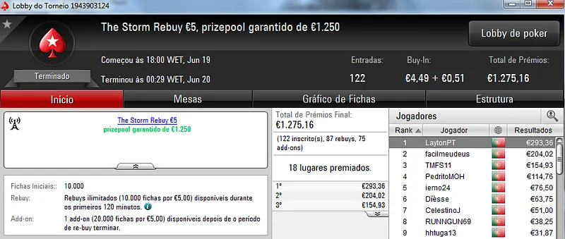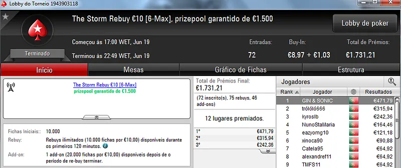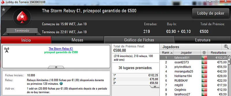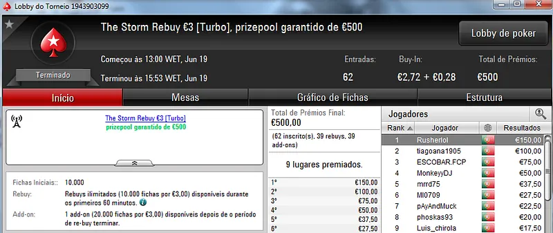 O Sunday Storm €10 foi bem mais concorrido e acumulou 851 entradas que perfizeram um prize pool de €7,633 a ser repartido pelos 125 melhores classificados. No topo da classificação, tangran encaixou o único prémio de 4 dígitos do torneio, cerca de €1,231. O segundo classificado, dm pinheiro recebeu €914. Já DelmaRibeiro na terceira posição faturou €678.
