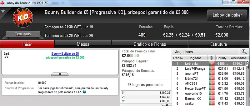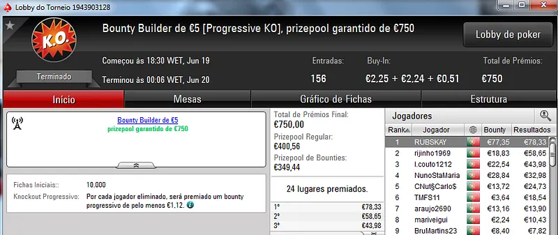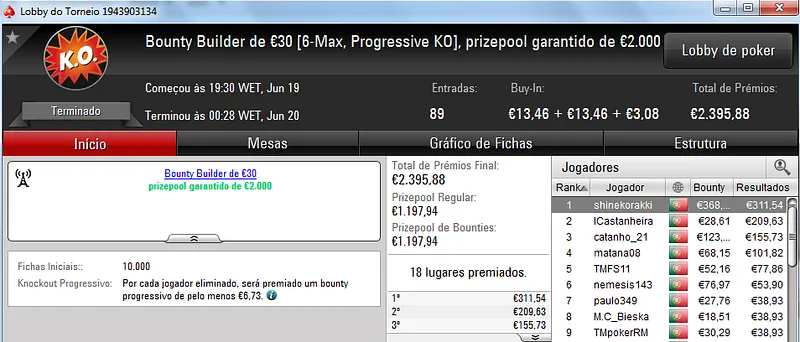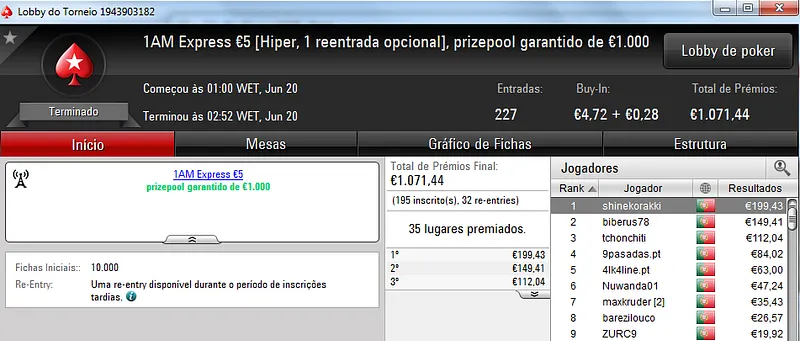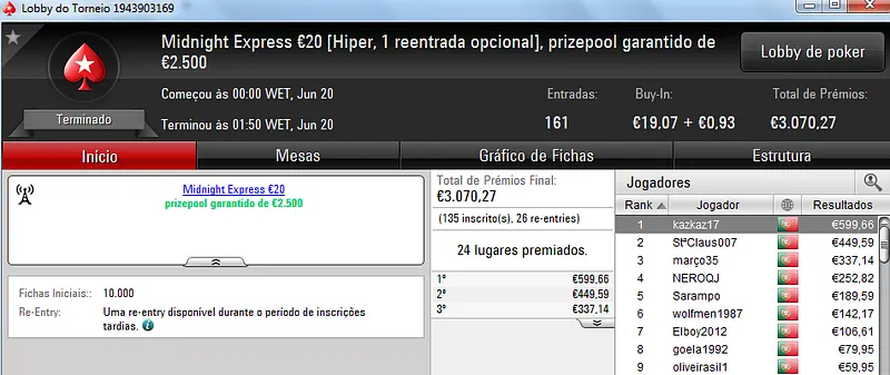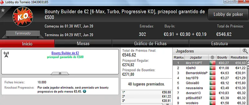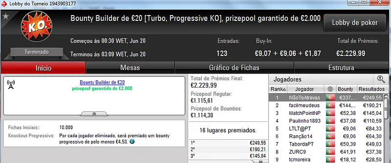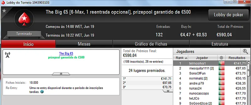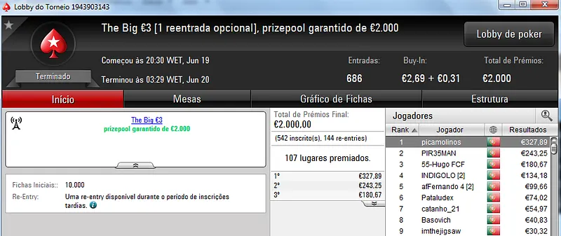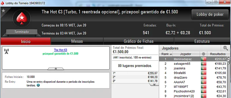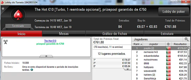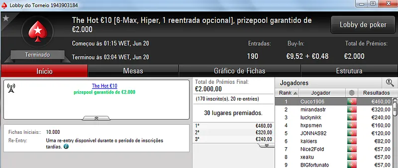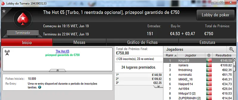 O The Hot BigStack Turbo €50 contou com 101 registos e o prize pool de €4,578 foi distribuído pelos 18 melhores jogadores. Com o único prémio de 4 dígitos deste torneio ficou ruiven que venceu o heads-up a NunoRito77 (€801) para receber €1,190. Na terceira posição, pbzorazzz recebeu €595.