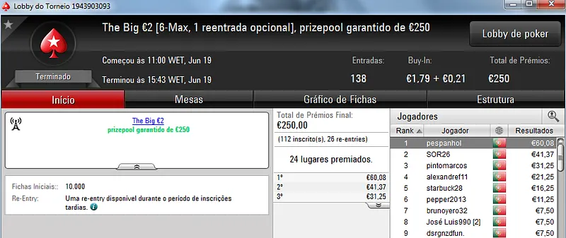 O grande vencedor do Sunday Special €100 acabou por ser pinoquio7 que recebeu €1,980 depois de chegar a acordo com os outros dois jogadores do pódio. Para o segundo classificado, bebecas0 ficaram reservados €1,960, enquanto na terceira posição, Squeezamos recebeu um pouco menos, cerca de €1,300. Este torneio contou com 108 entradas que não atingiram o prize pool garantido de €10,000.