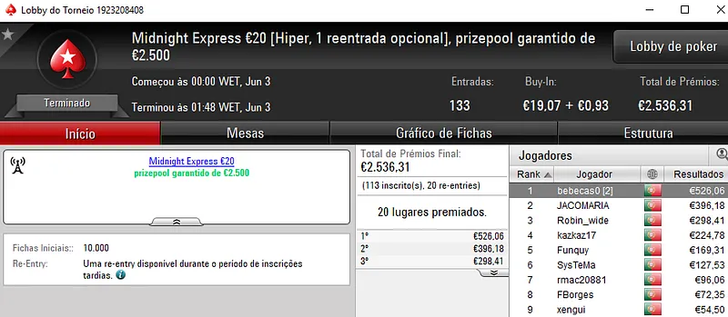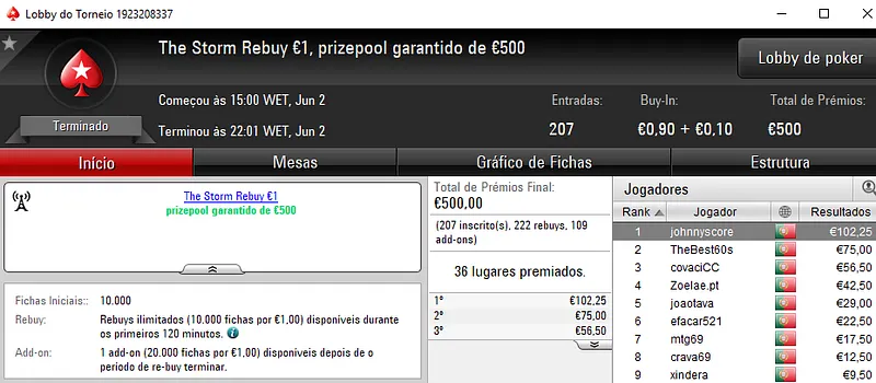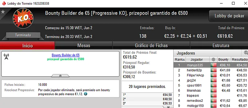 O prémio de €985 ficou nas mãos de angel_kikin que venceu jabsalgueiro no heads-up (€875). Na terceira posição do pódio, Pedro "jgrhajsj" Cabeça levou €450.
