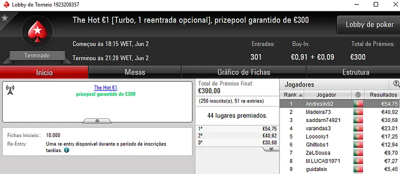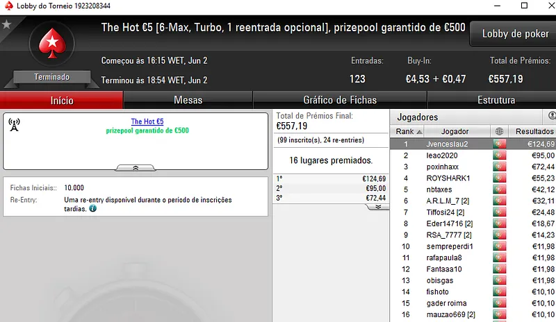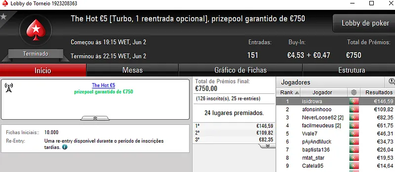 O outro grande torneio da sala, o The Hot BigStack Turbo €50 registou 70 entradas e o prize pool de €3.173 foi distribuído pelos 12 melhores classificados. BrunoLopes85 ficou no topo da classificação e recebeu €864. Na segunda posição, sneaDTP encaixou €579, enquanto Bp1nt0 recebeu €444 pelo último lugar do pódio.