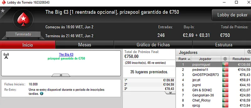 Mesmo assim, angel_kikin esteve bem próximo de faturar um prémio de 4 dígitos, não fosse o acordo realizado no heads-up do The Big €100. Este torneio contou com a participação de 25 jogadores que totalizaram 32 entradas. O prize pool garantido não foi atingido e os €3.000 foram distribuídos pelos 6 melhores jogadores.