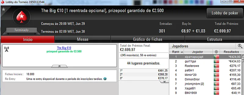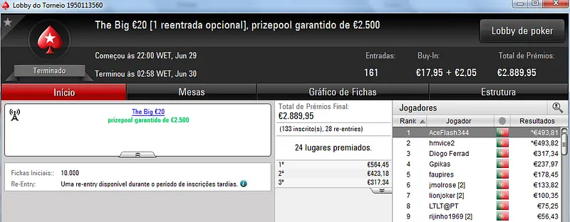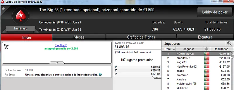O The Big €100 contou com 31 registos e o prize pool garantido não foi suplantado. Os dois primeiros prémios acabaram por ser divididos no heads-up onde pasmasseiro recebeu a maior fatia, cerca de €935. No segundo lugar, kazkaz17 recebeu €924. No último lugar do pódio, igorpintas encaixou €450.
