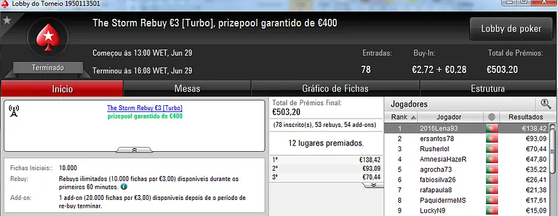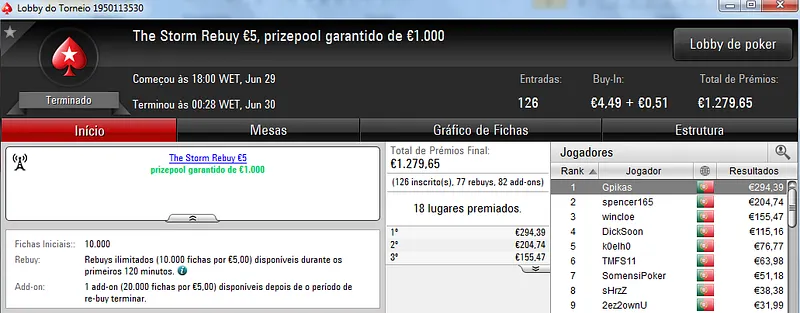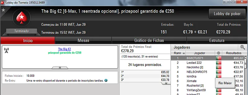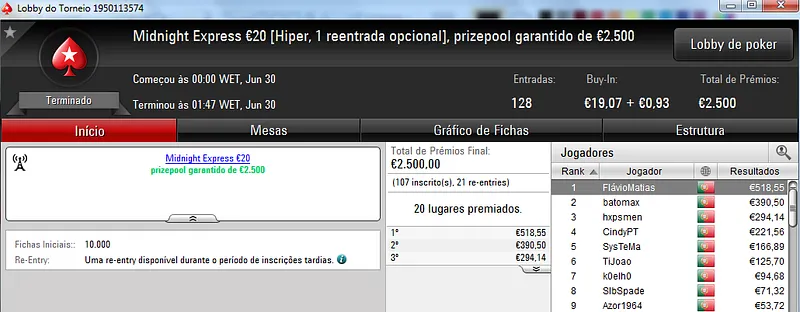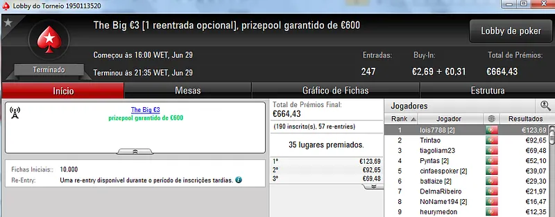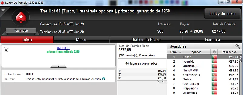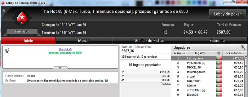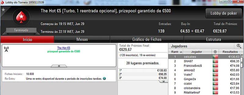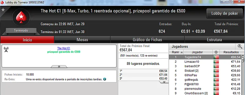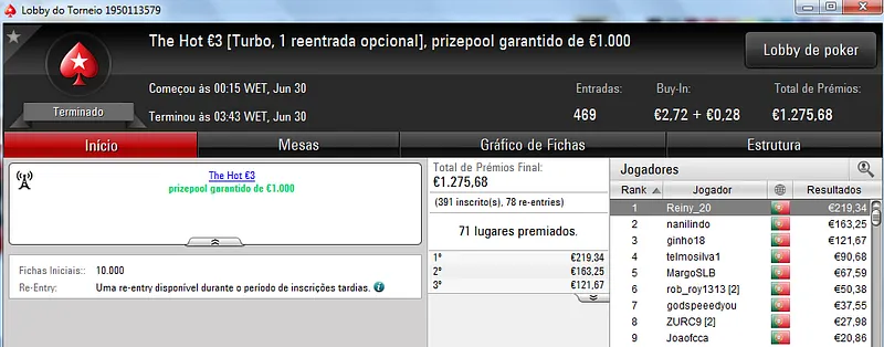 O grande vencedor foi El Flatador que conquistou o The Hot BigStack Turbo €50 com 95 entradas para receber €1,119. O prize pool chegou aos €4,306 e no segundo posto, K0elh0 recebeu €753. A fechar o pódio, dreamer8687 arrecadou €559.