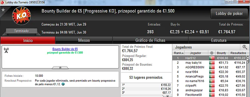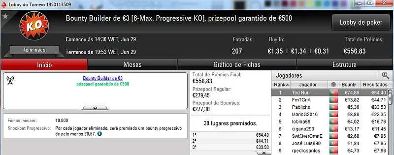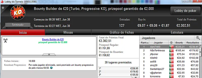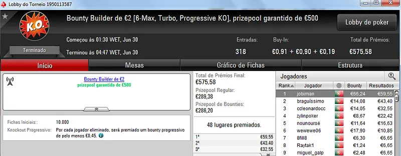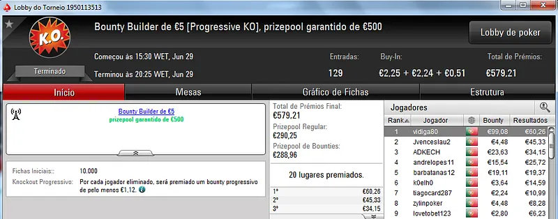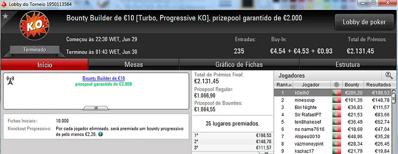 Já K0elh0 recebeu €484 pela vitória no Bounty Builder €10 e ainda somou mais €126 pelo 4º posto no Bounty Builder €20.