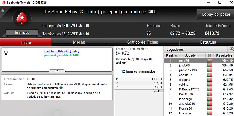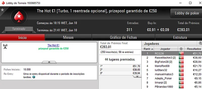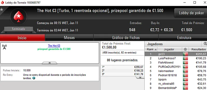 ManuelLima conquistou o The Hot BigStack Turbo €50 com 61 jogadores e recebeu €938. Este torneio registou 76 entradas e o prize pool chegou aos €3,445. Na segunda posição ninesoup encaixou €628, enquanto SeniMaria levou €482 pelo terceiro lugar.